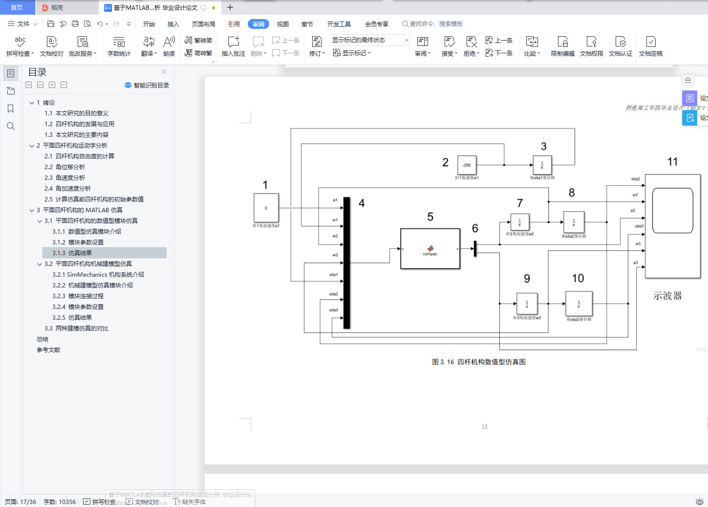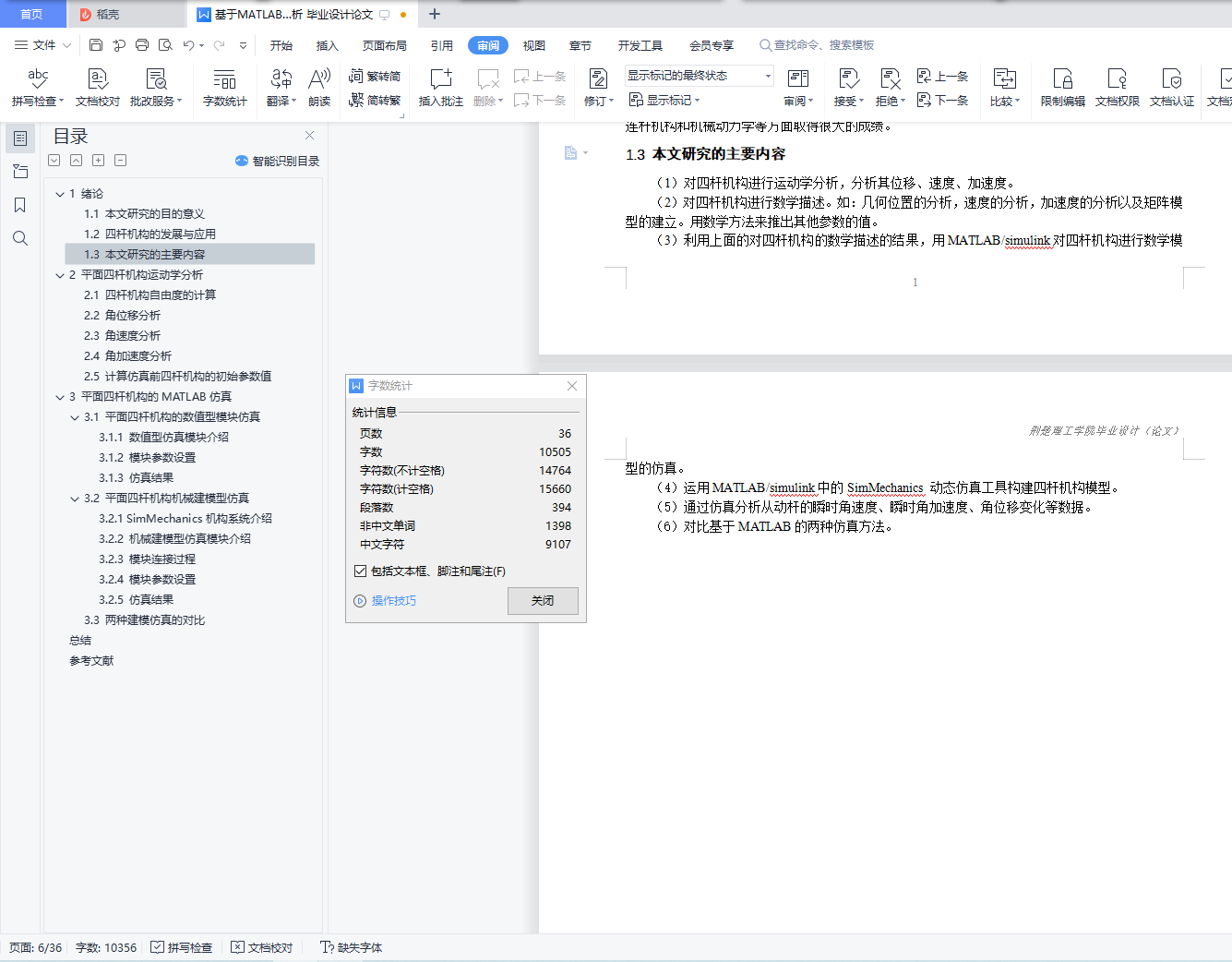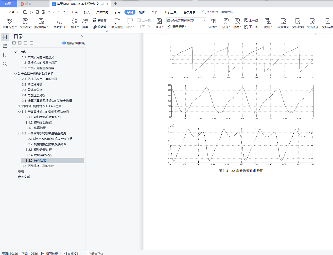 基于MATLAB虚拟仿真的四杆机构运动分析摘 要在工程领域中,四杆机构是一种被广泛应用的传动机构。对四杆机构进行设计时,我们需要对其进行运动分析,得到运动过程中的杆的各个参数。应用计算机软件MATLAB对四杆机构进行运动学分析,可以轻松得到四杆机构在运动过程中,各杆的运动参数的曲线图。本论文研究内容为:(1)对四杆机构进行运动学分析,分析其角位移、角速度和角加速度,并对其进行数学描述。(2)利用对四杆机构的数学描述的结果,用MATLAB/simulink对四杆机构进行数值型的仿真。(3)运用MATLAB/simulink中的SimMechanics 动态仿真工具构建四杆机构模型并对其仿真。(4)通过仿真分析从动杆的瞬时角速度、瞬时角加速度、角位移变化等数据。(5)对比基于MATLAB的两种仿真方法。通过本文的研究,提供了用MATLAB对四杆机构进行运动学分析的方法。【关键词】四杆机构 MATLAB 仿真Motion analysis of four-bar mechanism based on MATLAB virtual simulationAbstractIn the field of engineering, four-bar mechanism is a widely used transmission mechanism. When designing the four-bar mechanism, we need to analyze its motion and get the parameters of the bar in the process of motion. By using the computer software MATLAB to analyze the kinematics of the four-bar mechanism, it is easy to get the curves of the motion parameters of the four-bar mechanism in the process of motion.The research content of this paper is as follows:(1) The kinematics of the four-bar mechanism is analyzed, and its angular displacement, angular velocity and angular acceleration are analyzed.(2) Based on the results of mathematical description of four-bar mechanism, the numerical simulation of four-bar mechanism is carried out with MATLAB / Simulink.(3) The four-bar mechanism model is built and simulated by using the dynamic simulation tool of SimMechanics in MATLAB / Simulink.(4) The data of instantaneous angular velocity, instantaneous angular acceleration and polar angle of driven rod are analyzed by simulation.(5) Compare the two simulation methods based on MATLAB.Through the research of this paper, the method of kinematic analysis of four-bar mechanism with MATLAB is provided.【Key words】four bar linkage MATLAB simulation目 录1 绪论 (1)1.1 本文研究的目的意义 (1)1.2 四杆机构的发展与应用 (1)1.3 本文研究的主要内容 (2)2 平面四杆机构运动学分析 (3)2.1 四杆机构自由度的计算 (3)2.2 角位移分析 (3)2.3 角速度分析 (3)2.4 角加速度分析 (3)2.5 计算仿真前四杆机构的初始参数值 (4)3 平面四杆机构的MATLAB仿真 (6)3.1 平面四杆机构的数值型模块仿真 (6)3.1.1 数值型仿真模块介绍 (6)3.1.2 模块参数设置 (7)3.1.3 仿真结果 (11)3.2 平面四杆机构机械建模型仿真 (15)3.2.1 SimMechanics机构系统介绍 (15)3.2.2 机械建模型仿真模块介绍 (15)3.2.3 模块连接过程 (16)3.2.4 模块参数设置 (20)3.2.5 仿真结果 (23)3.3 两种建模仿真对比 (28)总结 (29)参考文献 (30)