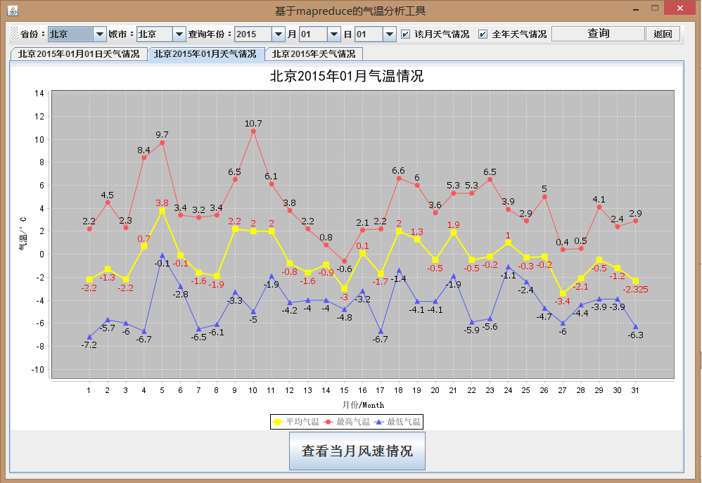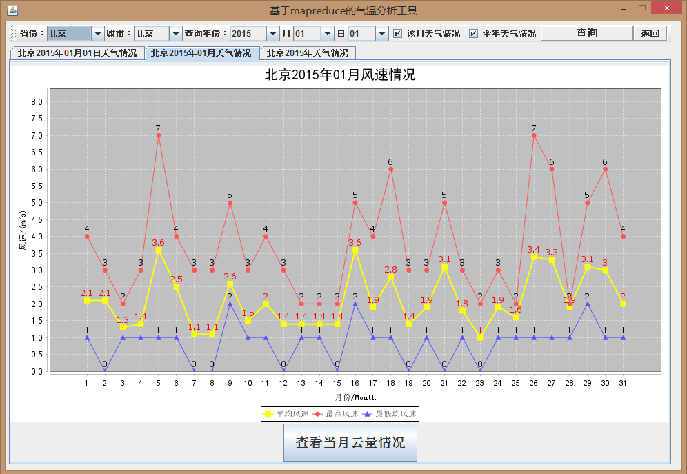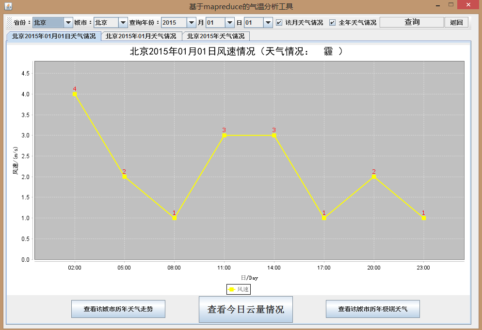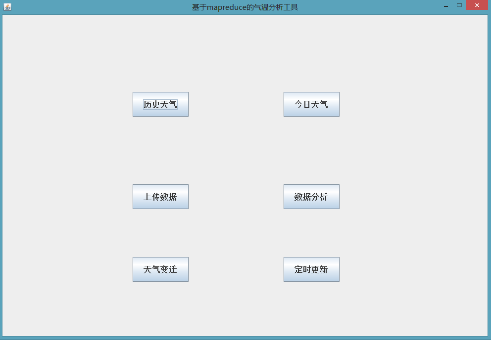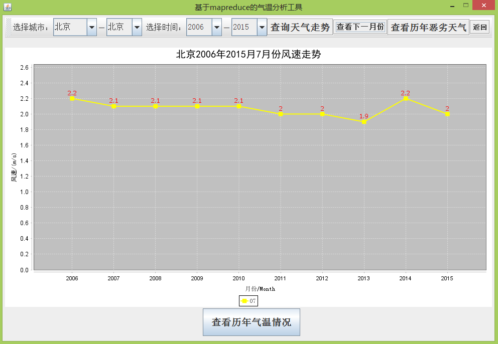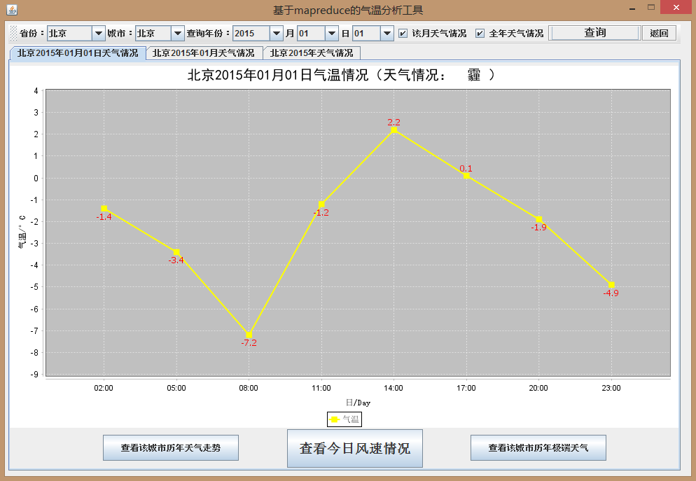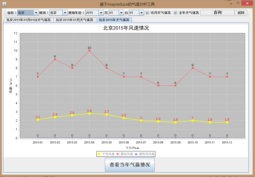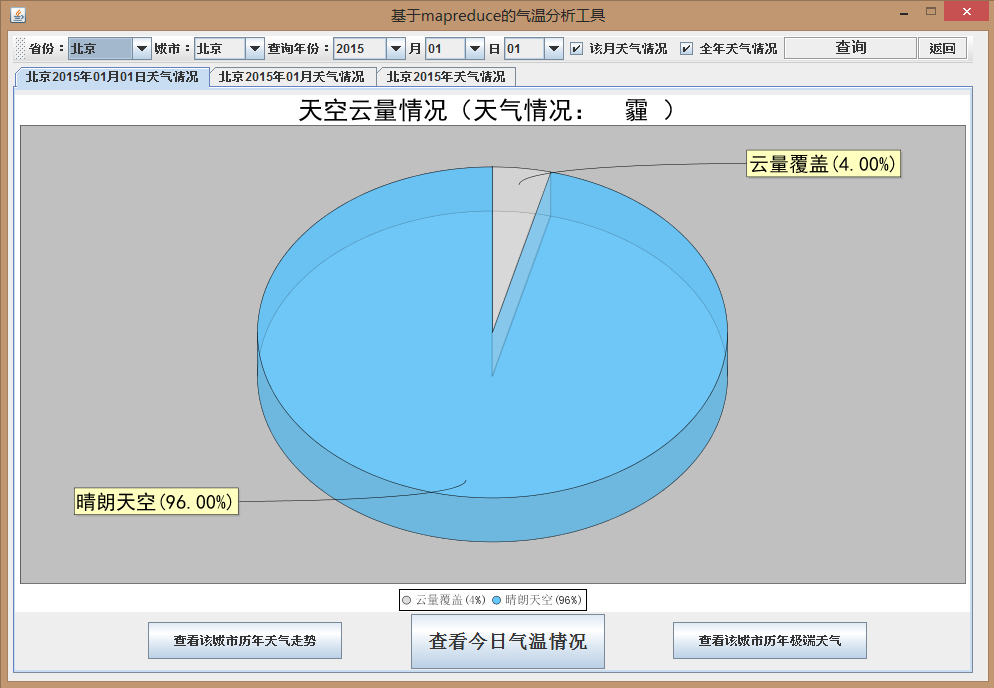 本课题将开发一款基于Hadoop的Mapreduce气象数据分析可视化系统。该系统使用户可以方便直观的查询当日气象情况,也提供了在系统中存储的海量气象历史信息的简单分析与查询功能。而且考虑到本软件的商用目的,在设计时考虑到了软件的可扩展性,安全性和速度。