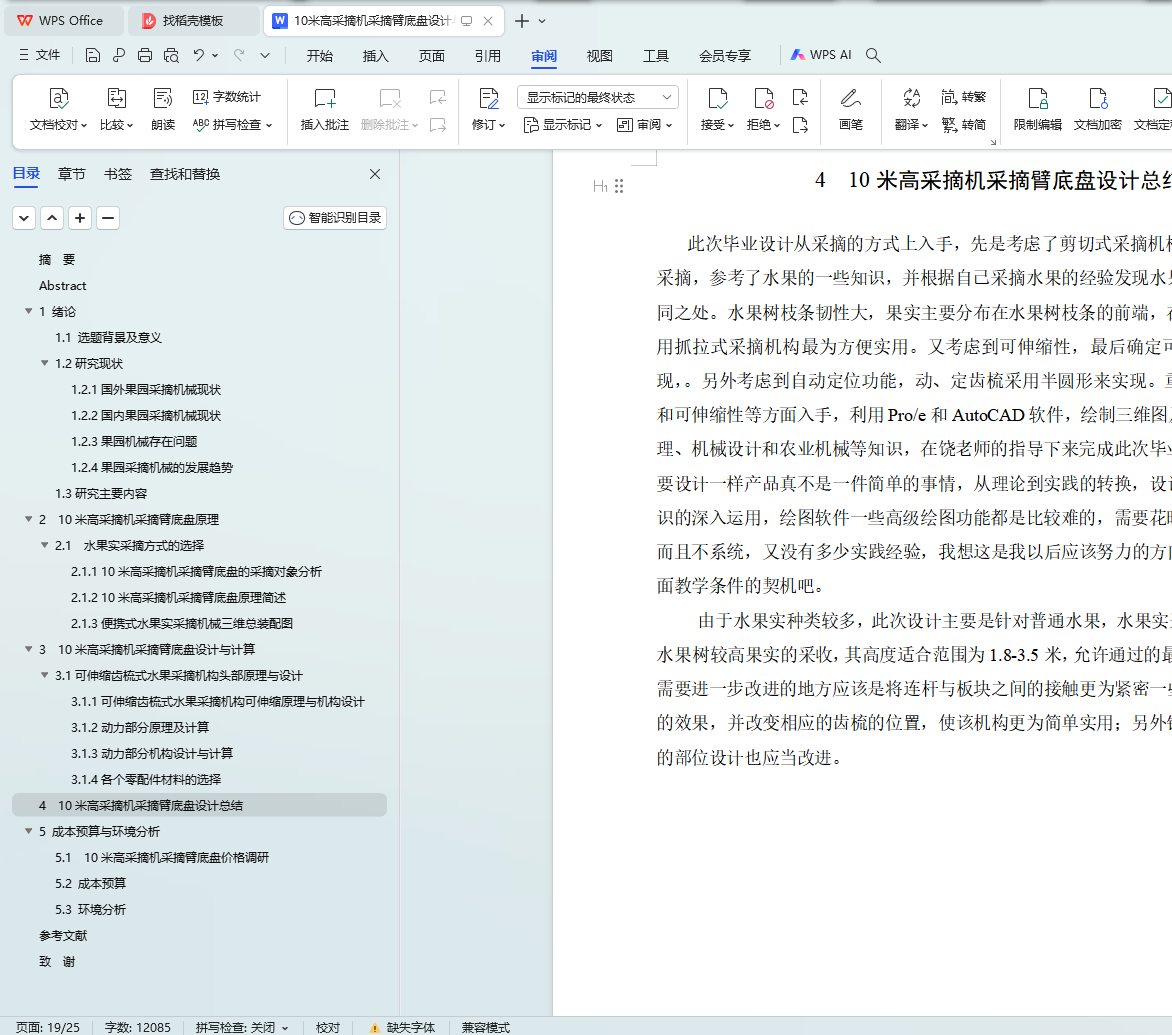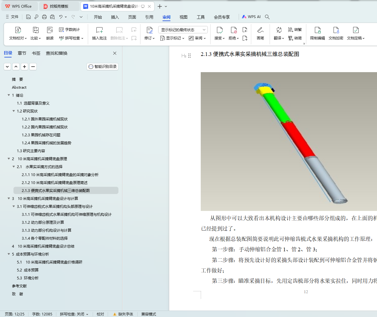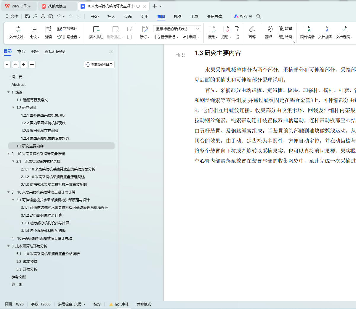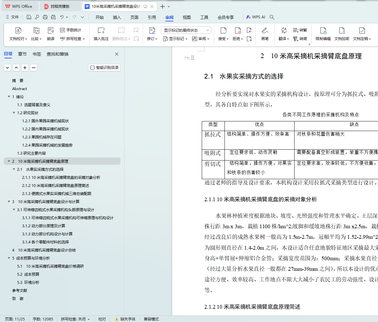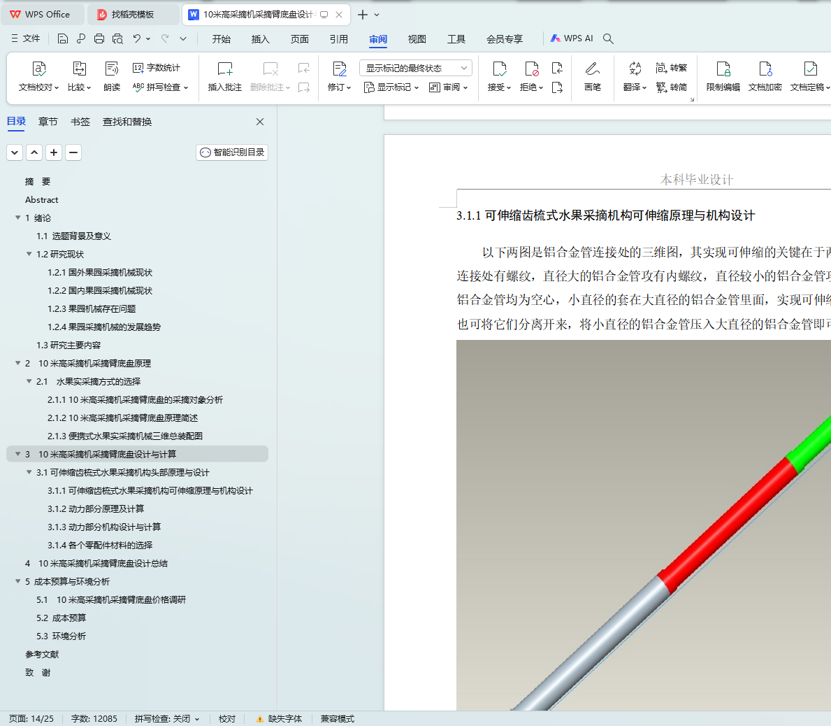 本文针对10米高采摘机的采摘臂底盘进行设计与运动分析。首先,基于实际采摘需求和作业环境,确定了采摘机的总体结构和功能。其次,详细设计了采摘臂底盘的结构,包括驱动系统、传动系统、支撑系统等部分,并对其进行了强度和稳定性的校核。接着,利用运动学和动力学原理,对采摘臂底盘的运动过程进行了建模和分析,预测了其运动性能和采摘效率。最后,通过实验验证了设计的可行性和采摘机的实际效果。本文的研究成果可为类似采摘机的设计提供参考,并为农业装备的智能化、高效化发展提供理论支持。