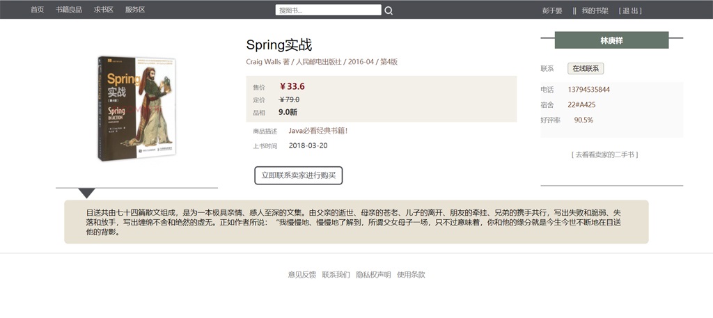 This design carries on the project design, the realization, the test and the deployment release according to the software engineering development specification, writes the corresponding design and the test document, creates the project running environment, completes the project to need the database creation and the source code to write. Use Spring、SpringMVC、MyBatis technology and vscode、idea development tools to achieve. The system mainly realizes the functions of publishing second-hand book information, searching book information, user message, background management and maintenance. There are three user roles in the system, administrator, registered user and unregistered user. The administrator mainly has the authority to manage the user, issue the announcement and so on, the registered user enters the system may carry on the information release, the message and so on operation, the unregistered user can only view the second-hand book sale and the purchase information. The realization of the system will provide great convenience for students and provide a way to effectively improve the recycling of books.
