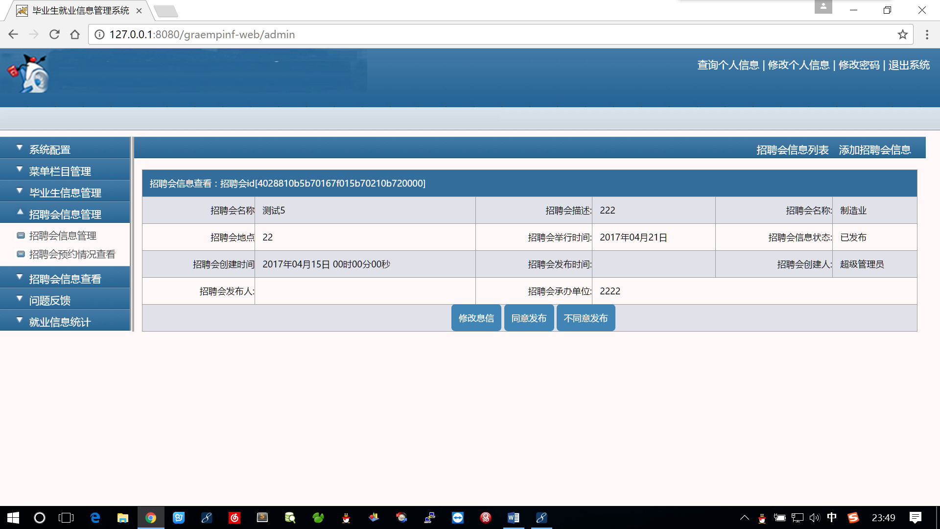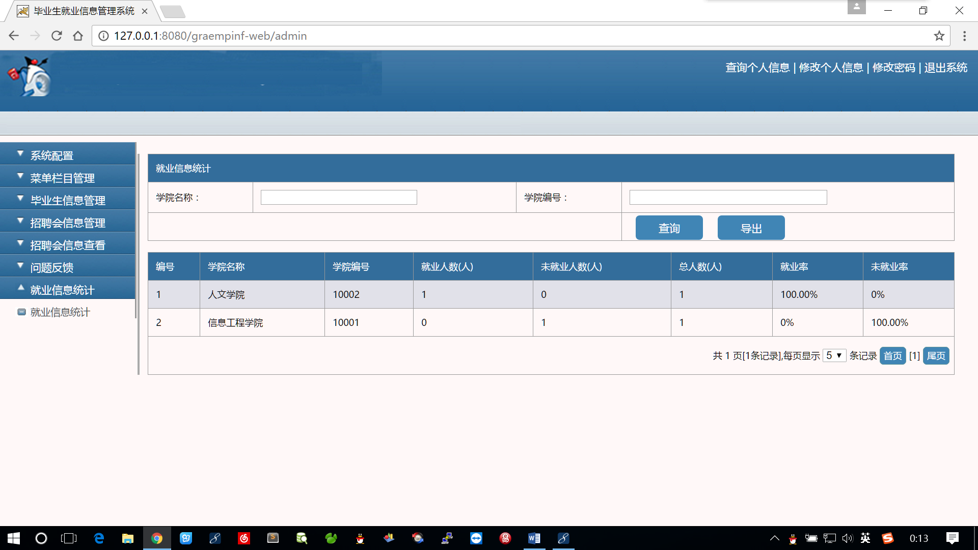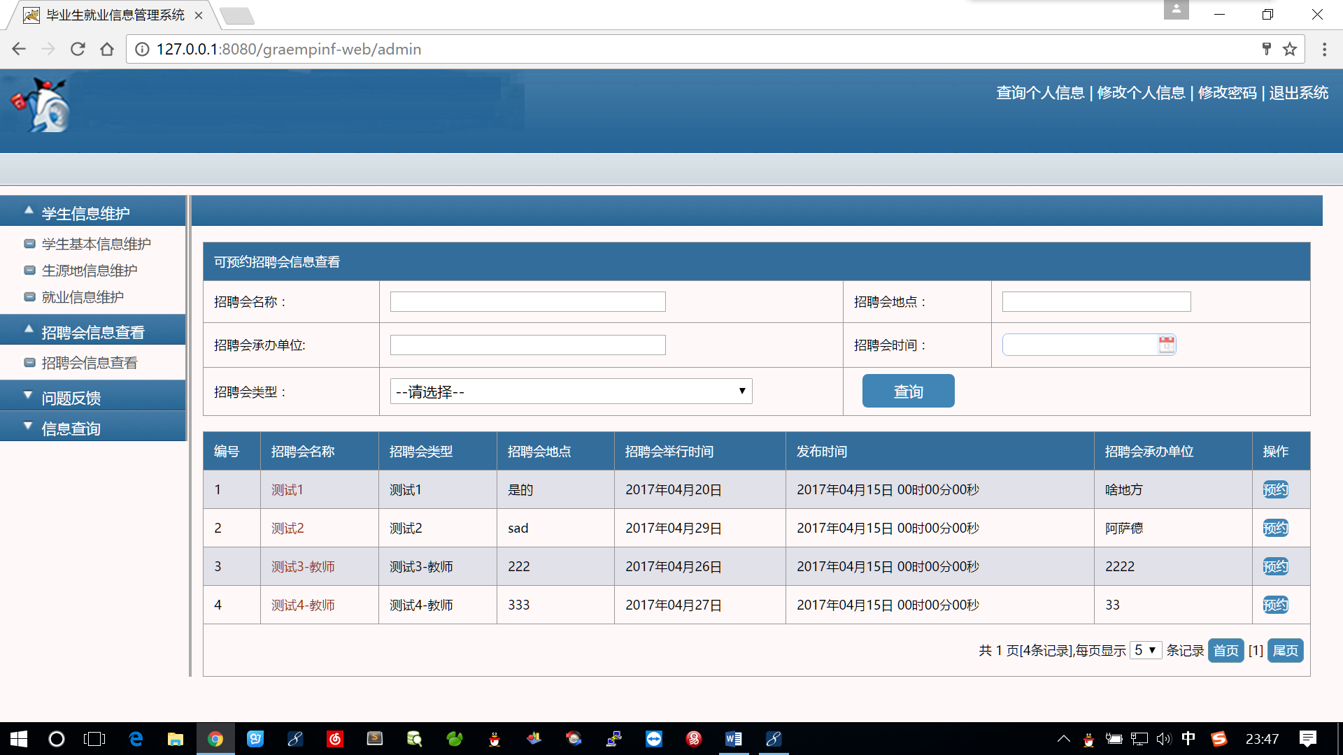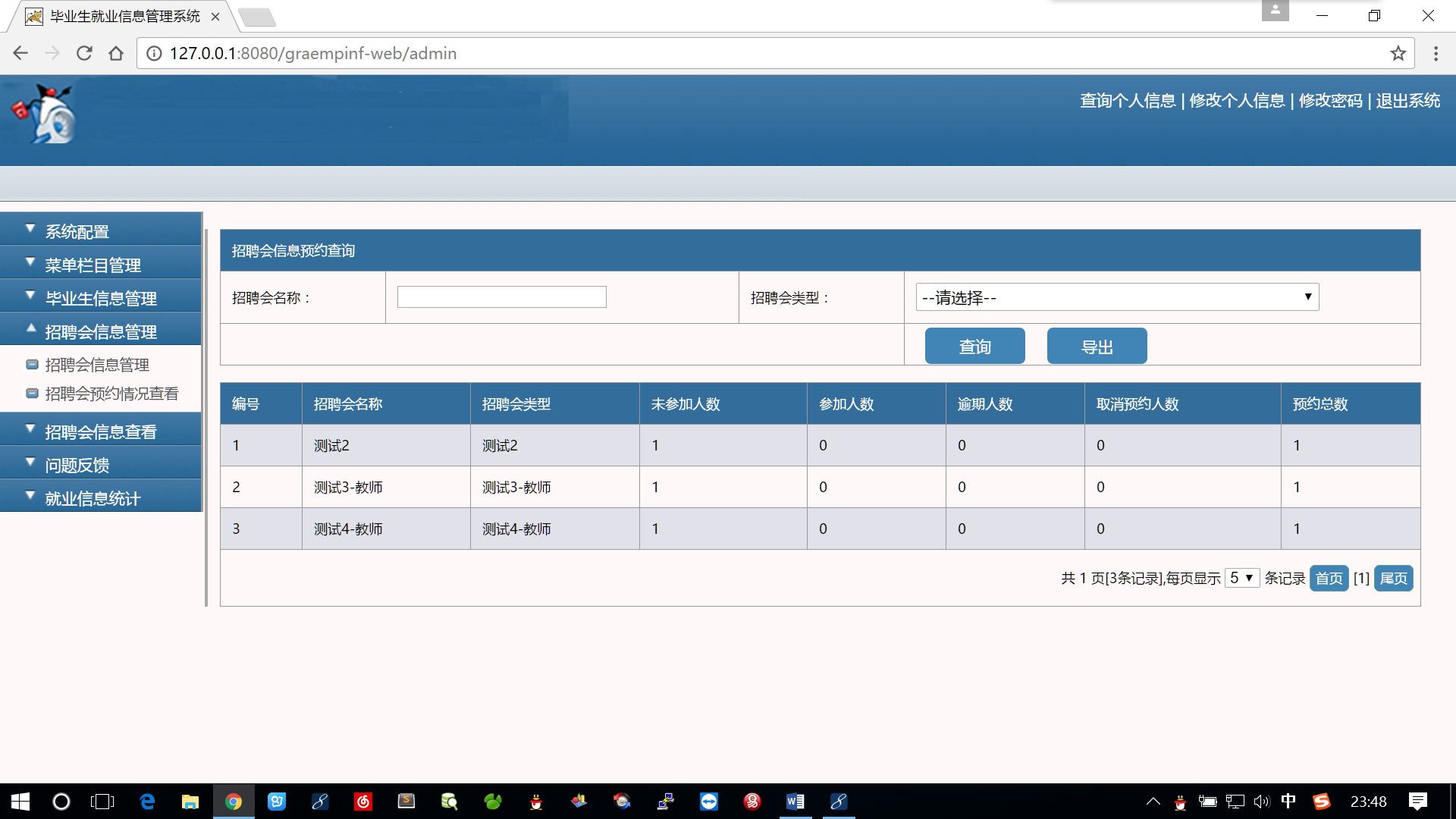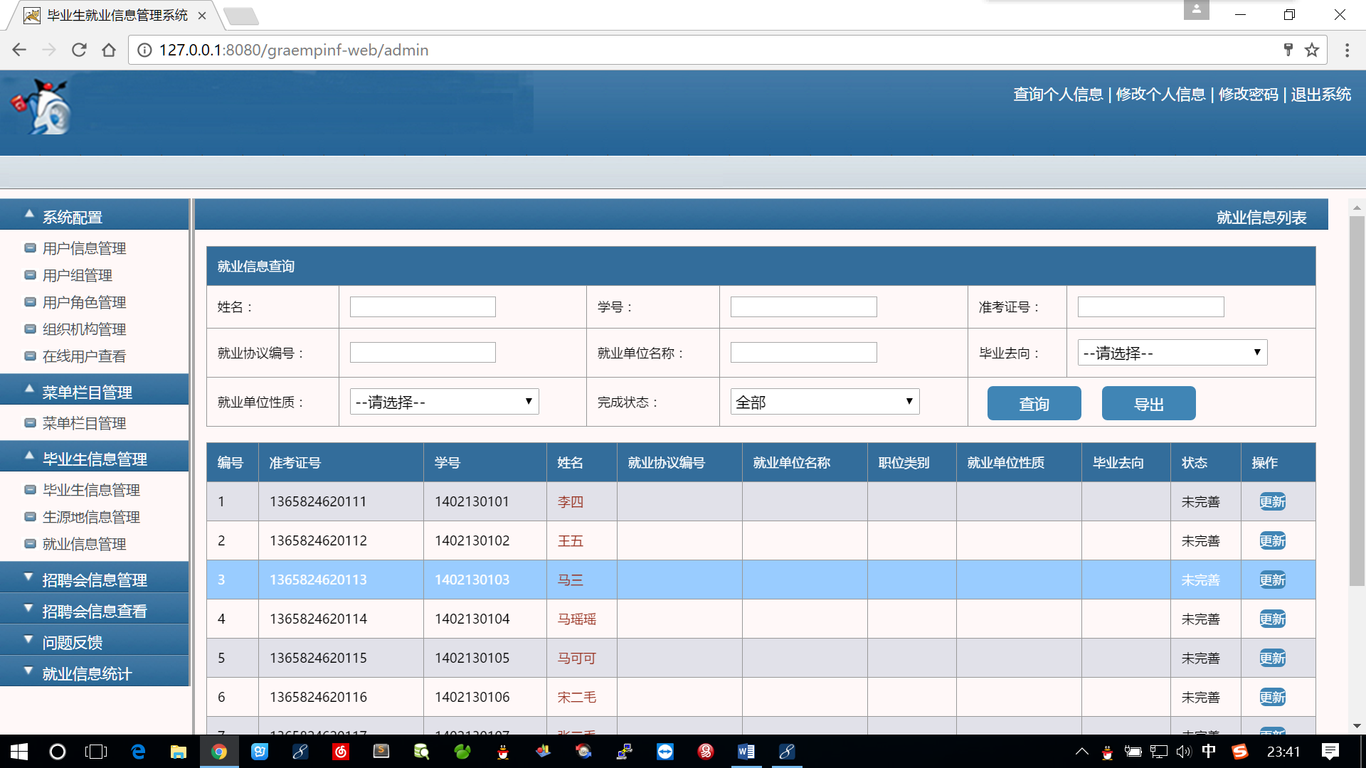 The system designs and implements the functional modules of student information management, employment information management, internship information management, recruitment information release, data statistics and so on. It not only provides a job management platform for employment guidance teachers, but also builds a bridge to enterprises and society for students. The system carries on the detailed requirement analysis before the design, the design is based on the SSM and the JAVA programming technology, uses the Mysql database to store the system data, pays attention to the process simplification, the structure rationalization. After testing, the system has complete function and stable operation, and can be widely used in the future employment management work.