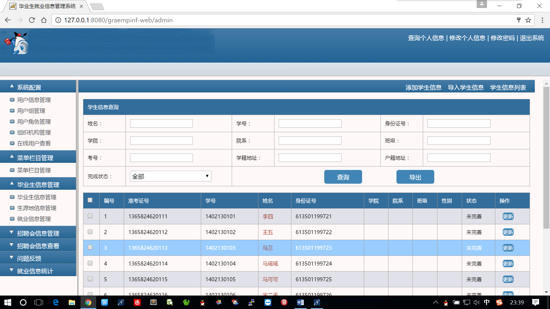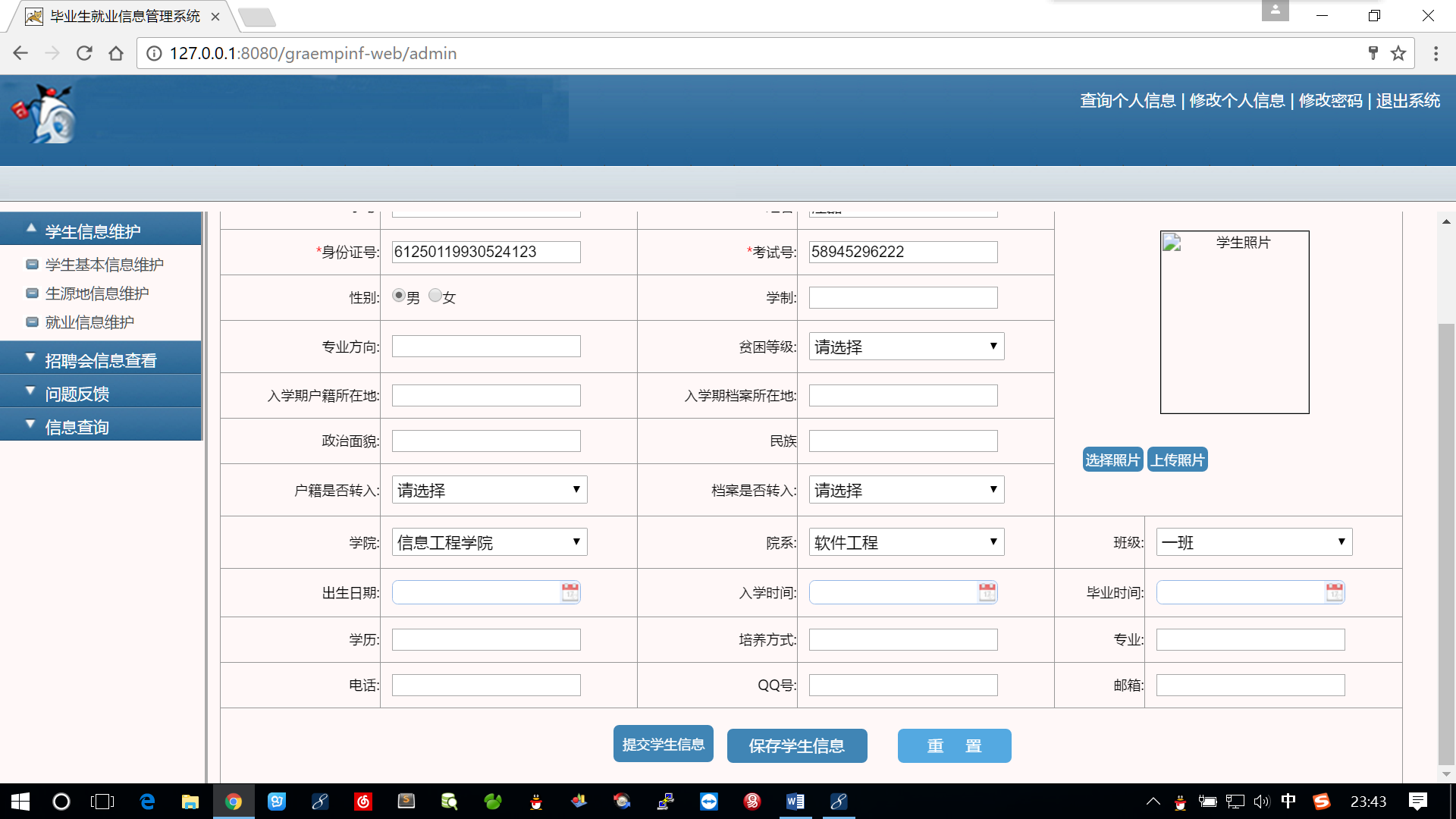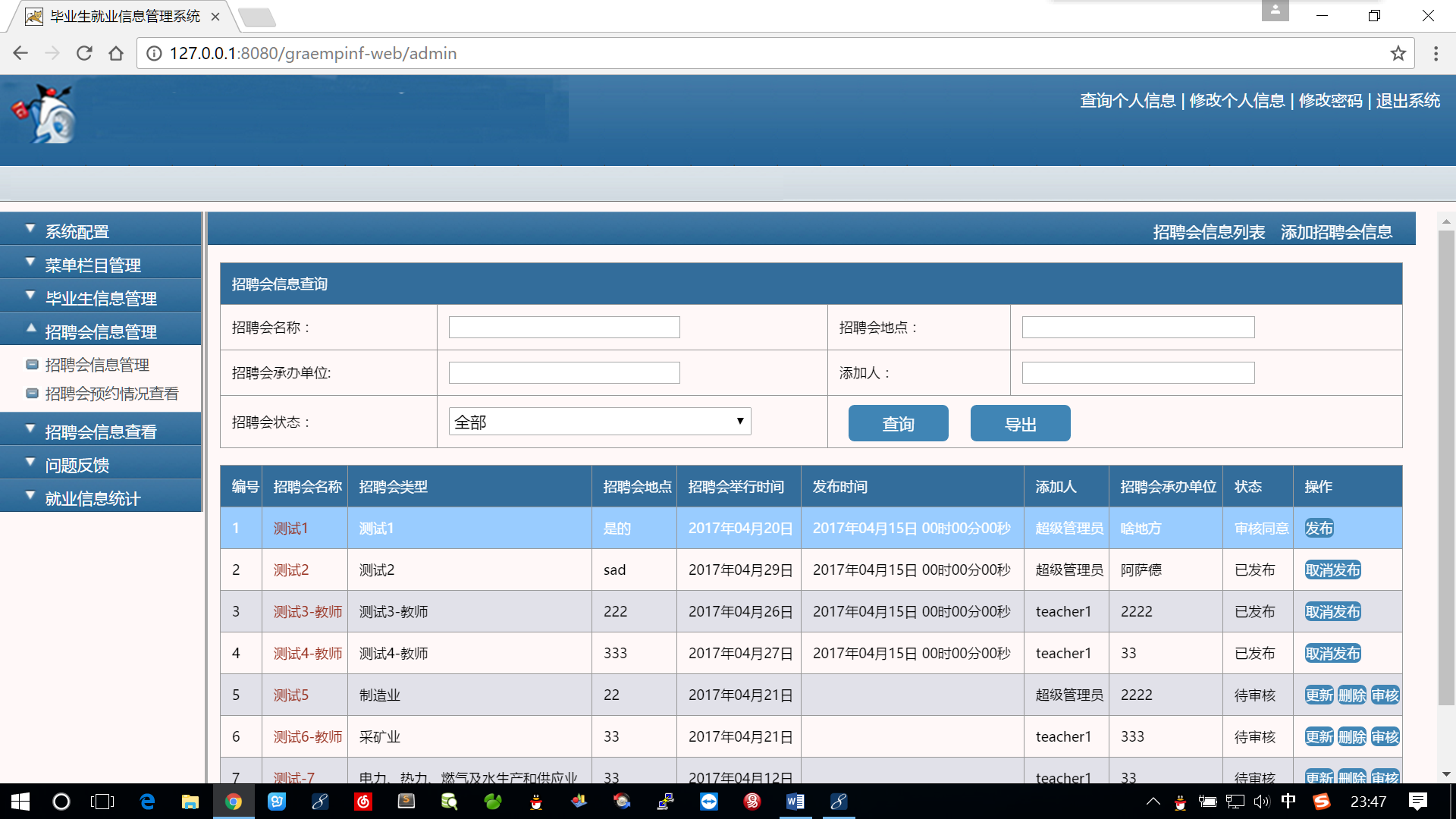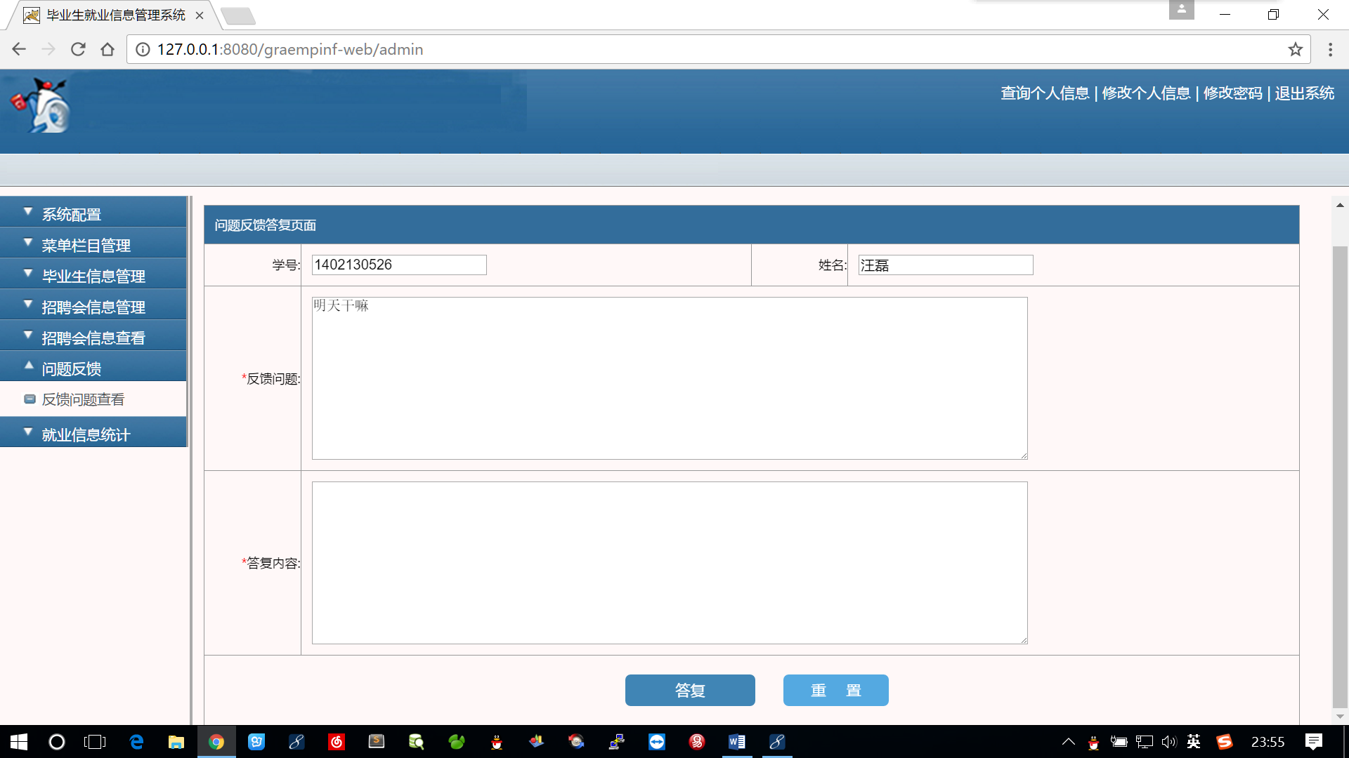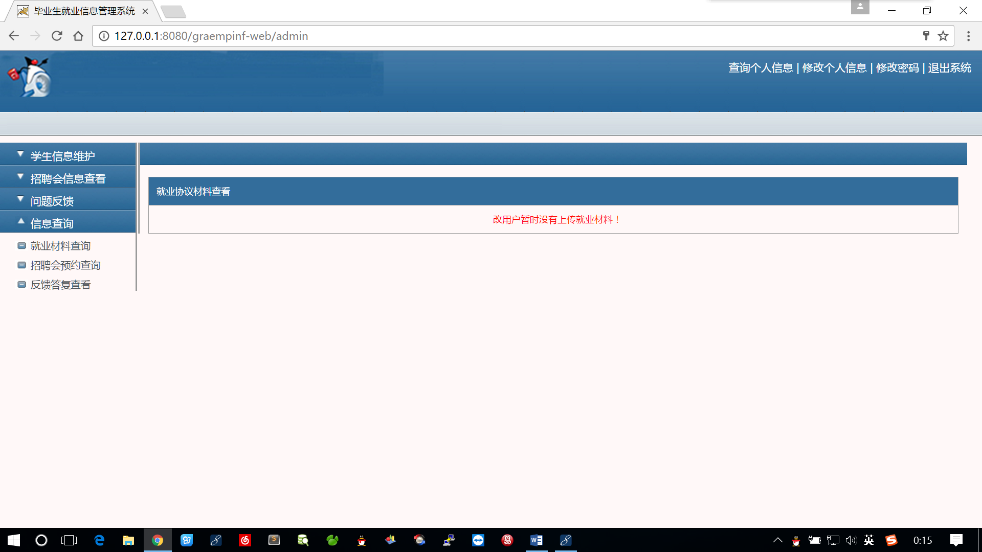 The system designs and implements the functional modules of student information management, employment information management, internship information management, recruitment information release, data statistics and so on. It not only provides a job management platform for employment guidance teachers, but also builds a bridge to enterprises and society for students. The system carries on the detailed requirement analysis before the design, the design is based on the SSM and the JAVA programming technology, uses the Mysql database to store the system data, pays attention to the process simplification, the structure rationalization. After testing, the system has complete function and stable operation, and can be widely used in the future employment management work.