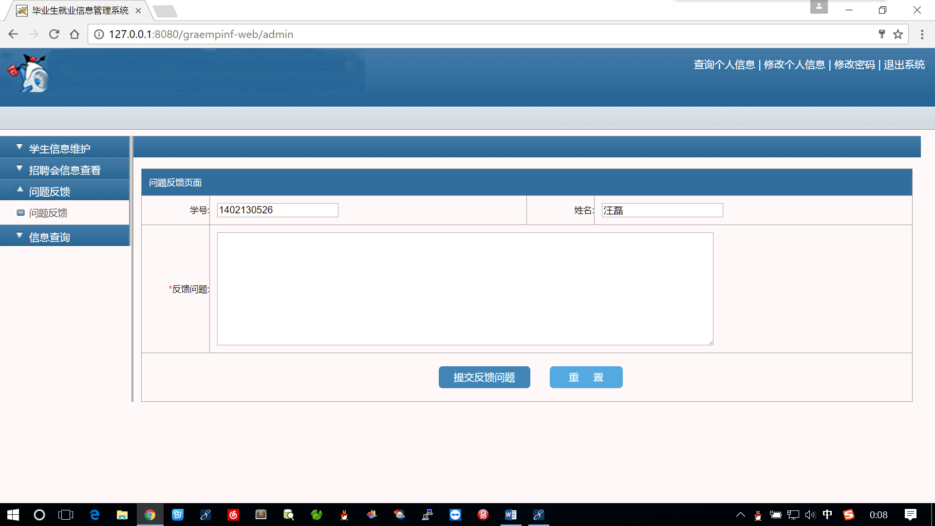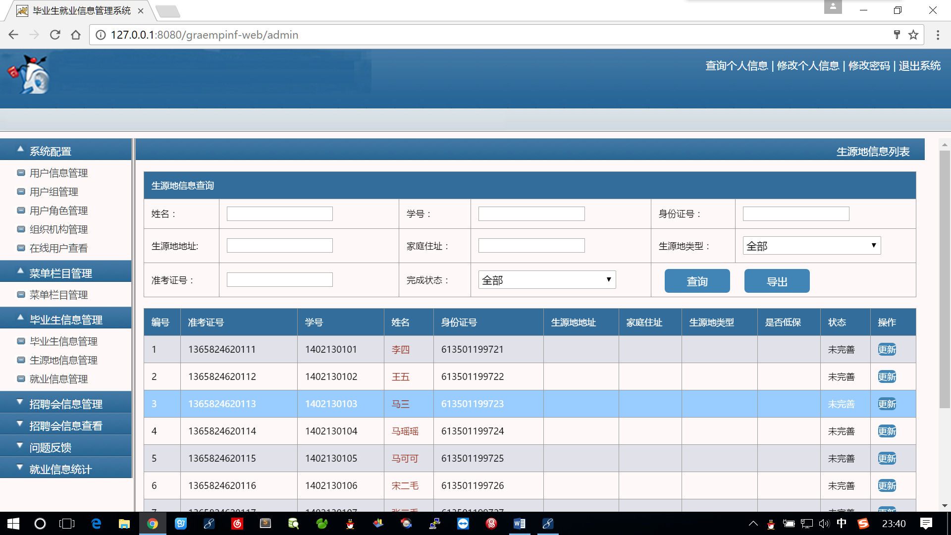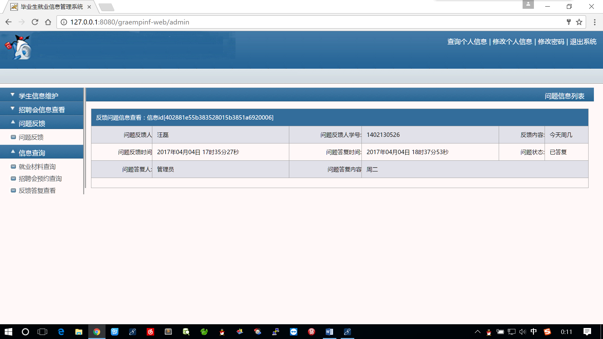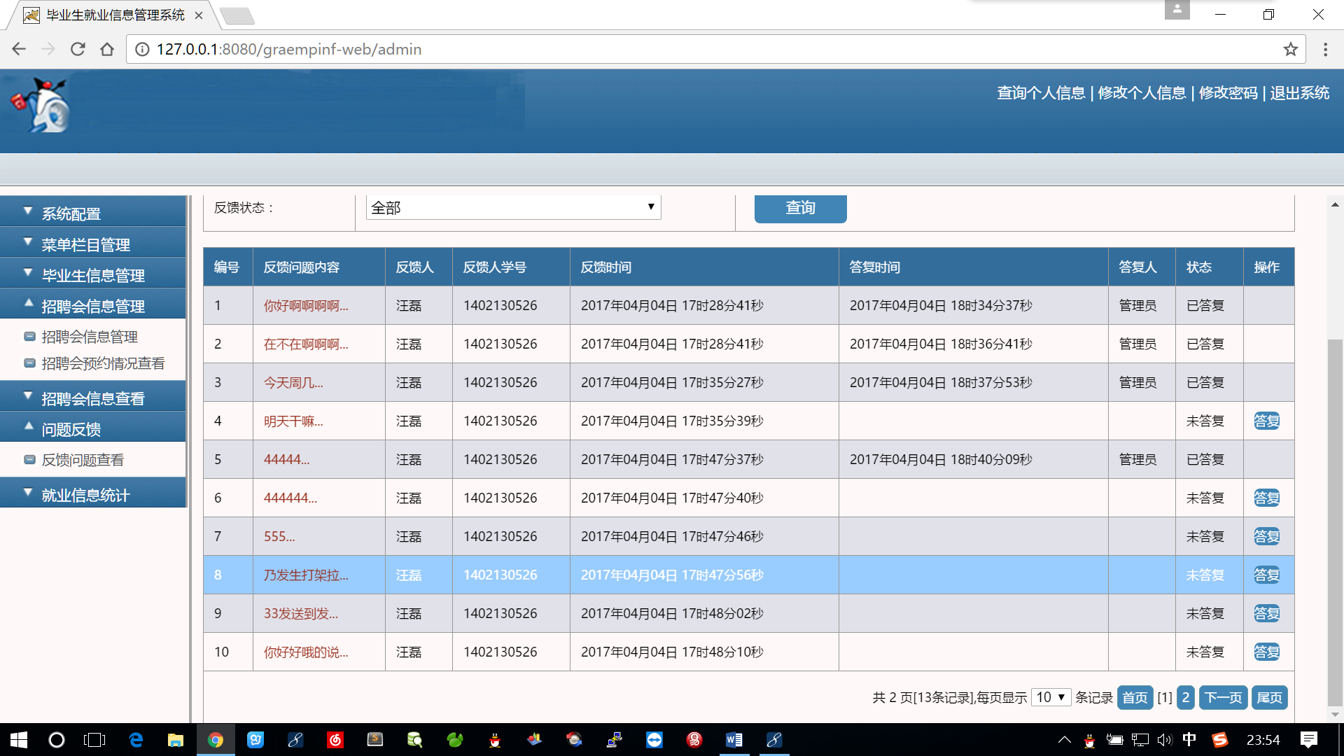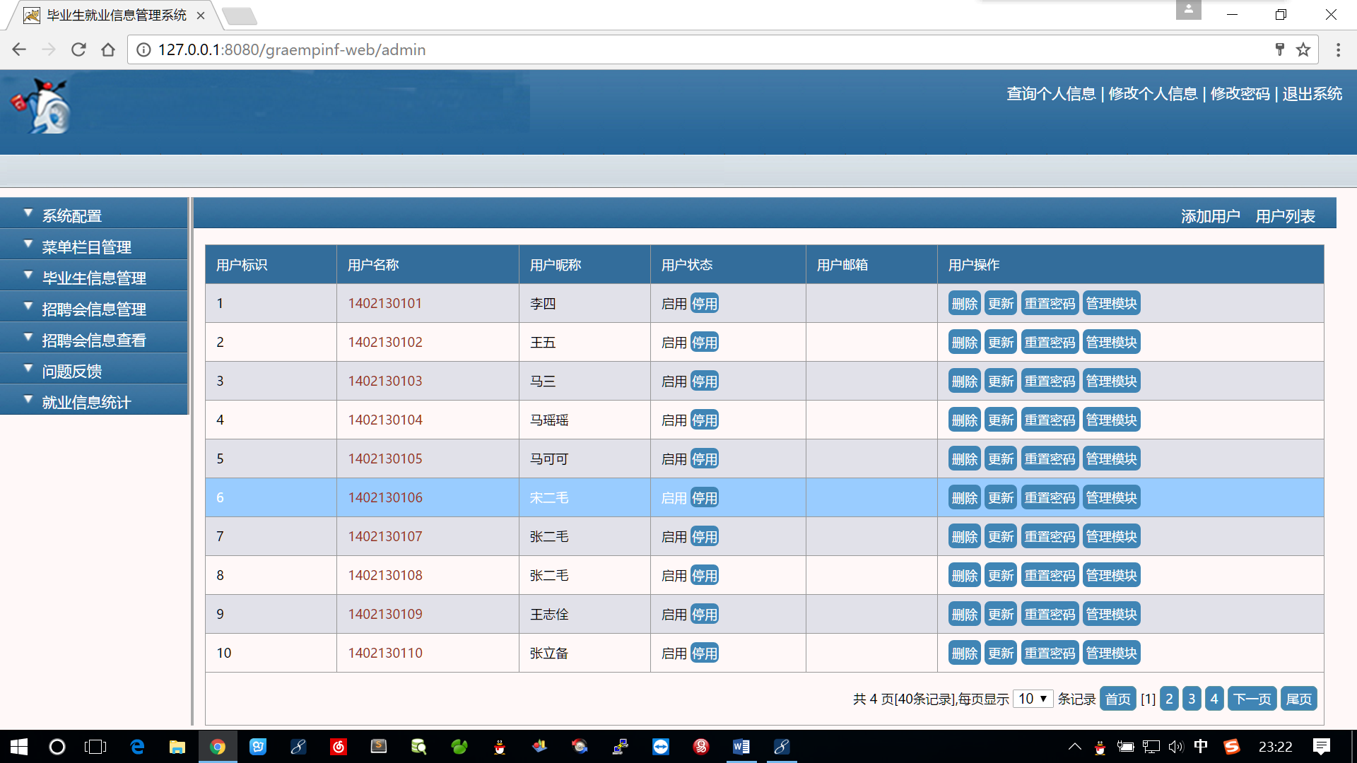 The system designs and implements the functional modules of student information management, employment information management, internship information management, recruitment information release, data statistics and so on. It not only provides a job management platform for employment guidance teachers, but also builds a bridge to enterprises and society for students. The system carries on the detailed requirement analysis before the design, the design is based on the SSM and the JAVA programming technology, uses the Mysql database to store the system data, pays attention to the process simplification, the structure rationalization. After testing, the system has complete function and stable operation, and can be widely used in the future employment management work.