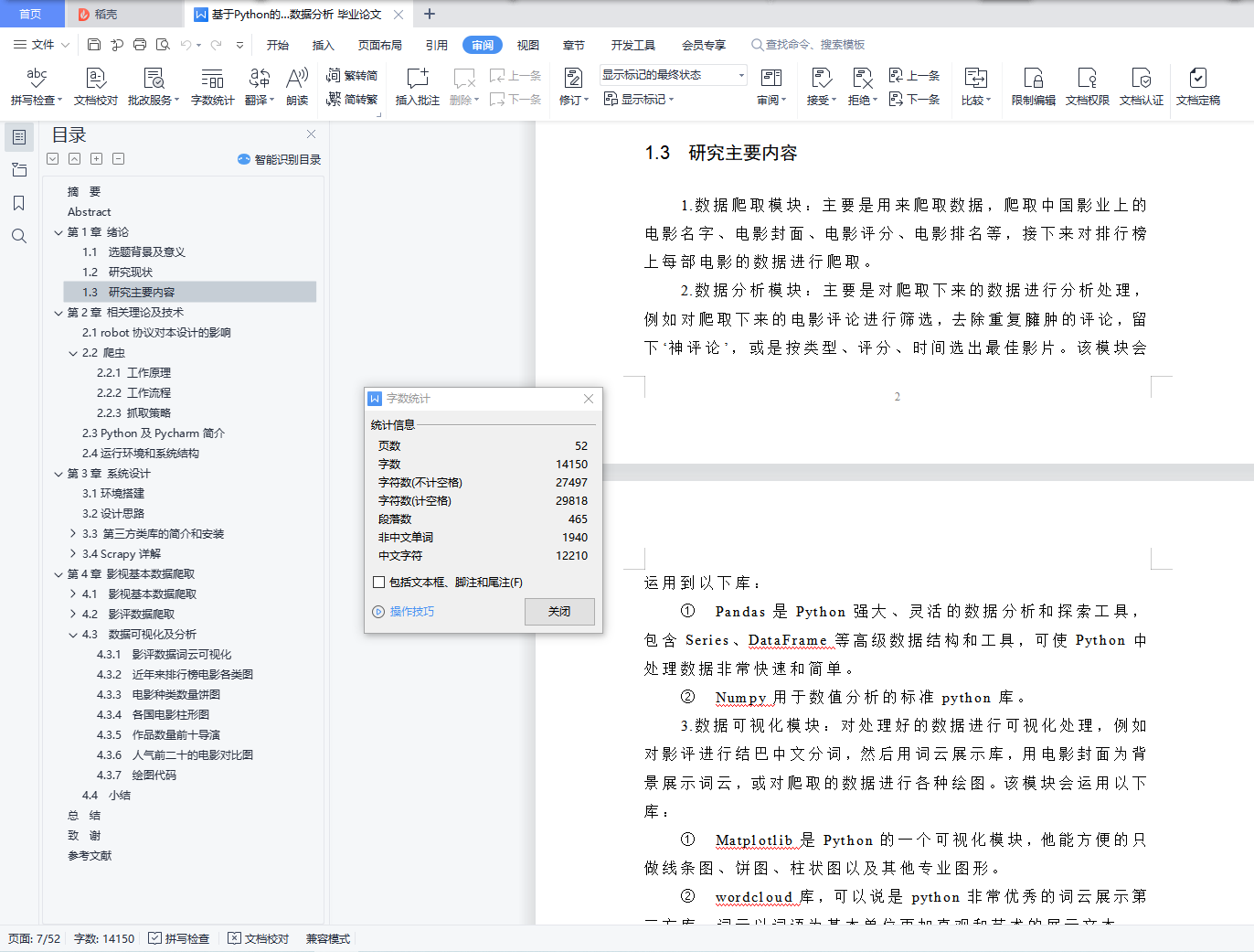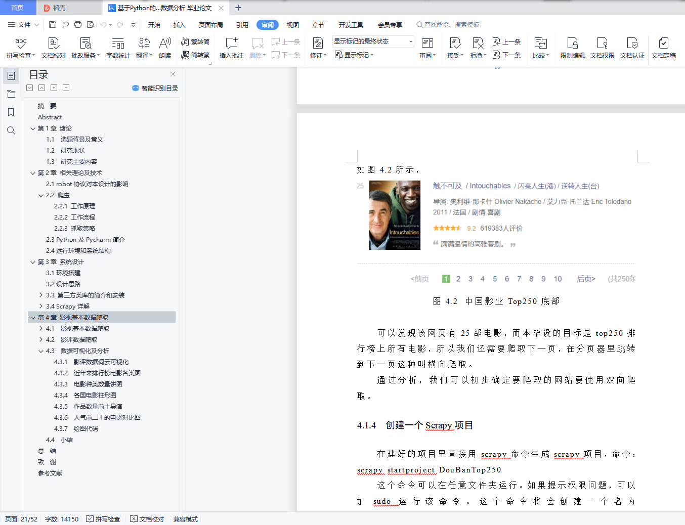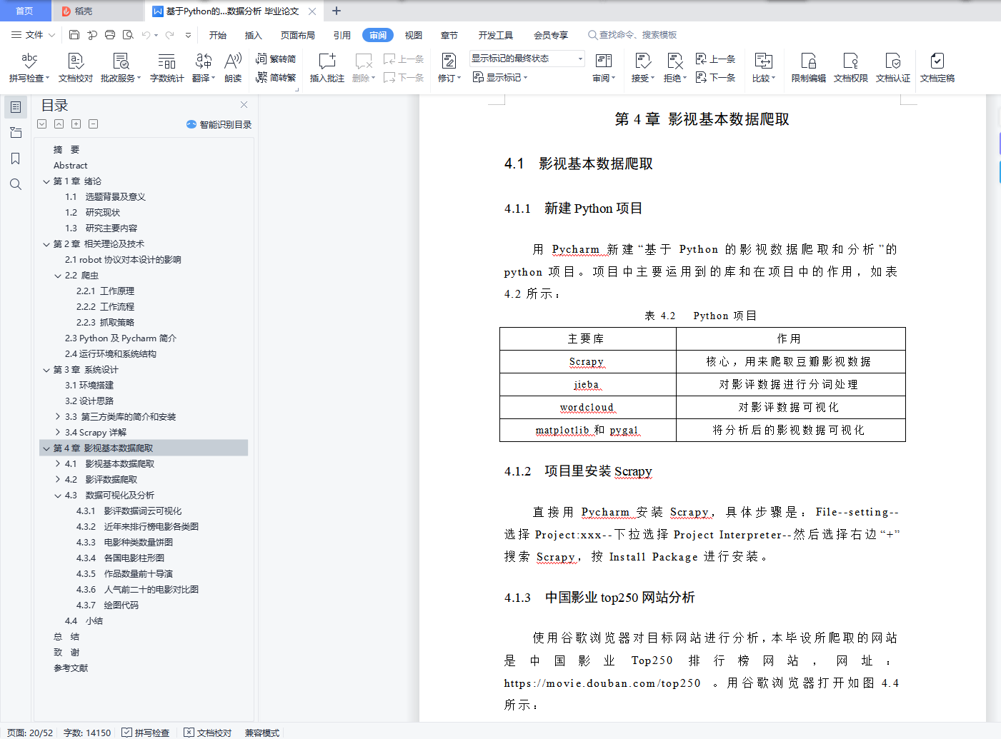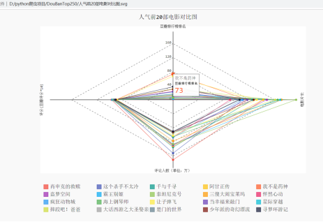 This graduation design uses the Python Scrapy framework to write the crawler program to grab the Chinese film industry film list information, crawls the movie short comment, the score, the appraisal quantity and so on data, and combines the Python multiple libraries (Pandas、Numpy、Matplotlib), uses the Numpy system to store and process the large data, the Chinese Jieba word segmentation tool carries on the word segmentation text processing, the wordcloud database processing data keyword, finally displays the audience emotion tendency and the film score statistics through the word cloud chart, the web page dynamic chart and so on information. With the full network information resources, the acquisition of network information is very important. The significance of this graduation project is to provide decision support for users to watch the film.
