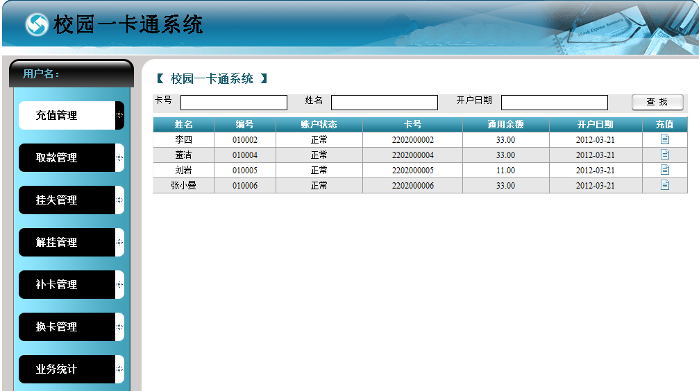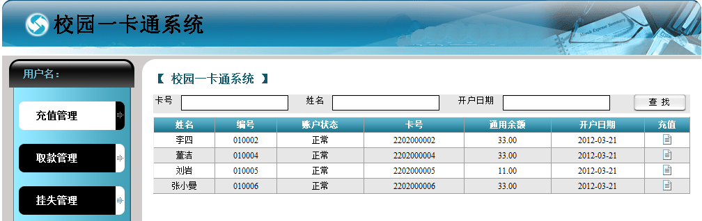 主要运用html5+css3,jquery,ASP.net,SQL sever2008等技术针对校园内的学生人群开发,是为学生提供了一个良好的一卡通管理平台,可以让用户能够方便的查询自己的信息内容、更改的管理系统。本系统的功能有管理员和普通用户、账户管理、挂失管理、使用记录管理等。最终完成具有前后台信息的交互,内容完整,功能完善,色彩搭配协调,页面美观,浏览器兼容,实现主要内容模块信息的添加、删除、修改和查询的功能的管理系统。