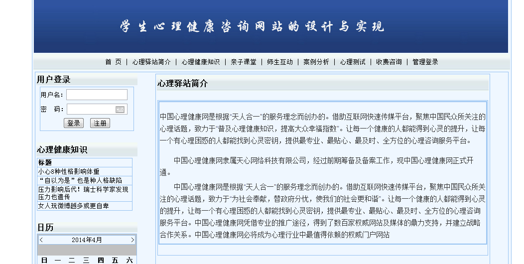 本设计尝试用VS2008在网络上架构一个心理健康咨询网站的设计,以使每一位学生都能够在线了解本心理健康的一些信息。本文从理论和实践两个角度出发,对一个具有数据挖掘功能学生心理健康咨询网站的设计进行设计与实现分析。论文首先较为详尽地介绍了面向对象分析与设计的有关概念与技术,特别深入介绍了在本系统中运用到的知识,如:面向对象的分析设计流程;系统中所用到的开发技术VS2008的特点、结构框架以及使用方法。接着对课程系统的可行性进行了分析,然后对系统的设计思想、设计目标与系统的整体结构进行了明确的规划。最后对系统的主要页面、数据库、应用程序的设计与实现作了较为详细的讲解。