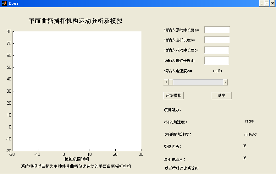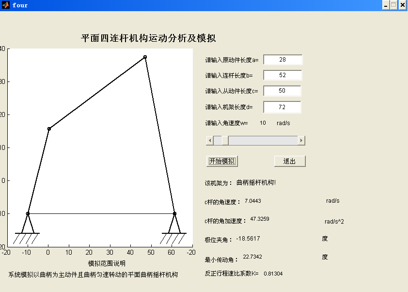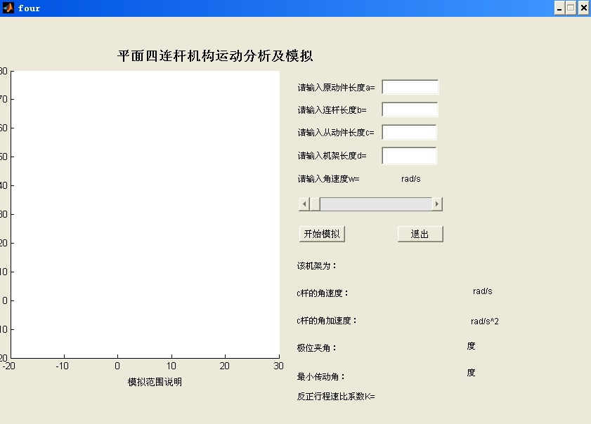 This design is the application of MATLAB GUI design tools and M program, combination of planar four-bar movement analysis, through the GUI realize interface design, through the M complete programming and commissioning, and through the interface realized four-bar movement analysis and simulation, interface runtime judge the mechanism type and displays the instantaneous velocity follower rod, instantaneous Angle acceleration, crank Angle between the minimum transmission Angle and anyway, stroke ratio coefficient.