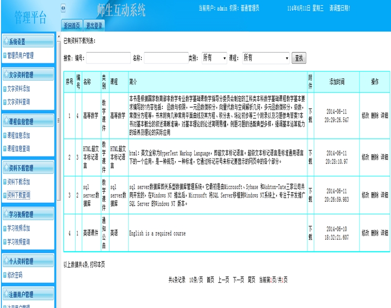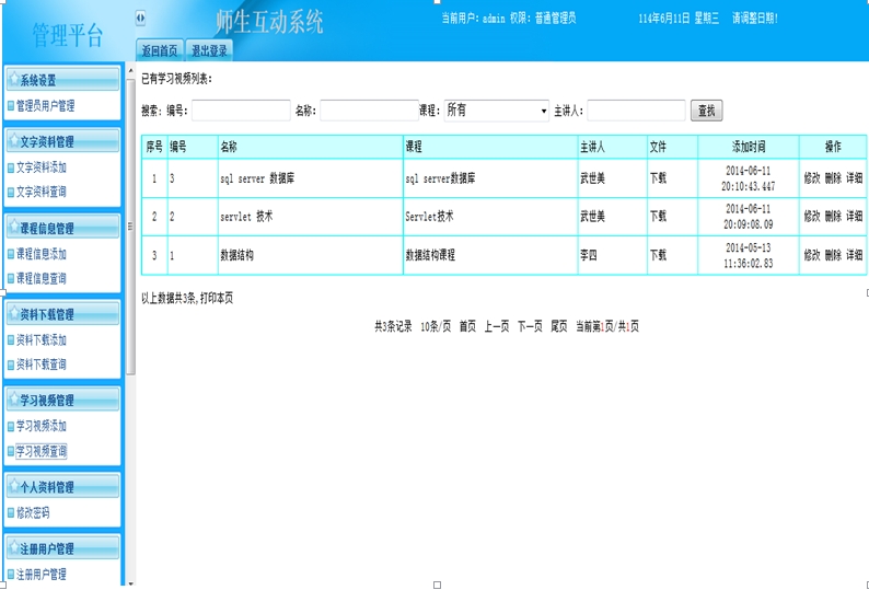 师生互动系统,指主体教师与学生或学生与学生进行网络交流互动学习中,涉及的一切网络学习资源,软、硬件设施和互动服务总和的系统。随着教育教学网络化的发展,针对目前xx大学软件学院网站教学功能发展的相对不足,提出建立一个使用频率较高的师生互动学习平台,积极满足时下院校网络教学的目的和要求。师生互动系统具有互动交流、方便快捷、教师与学生或学生与学生之间“零距离”接触等特点,教师和学生可以随时进行交流互动、及时解决问题、教师可以随时掌握学生的学习动态,不仅仅局限于以前的课堂,有利于提高我院的整体教学水平及学生学习的效率。本文对学习平台的框架模块进行分析、设计和实现。