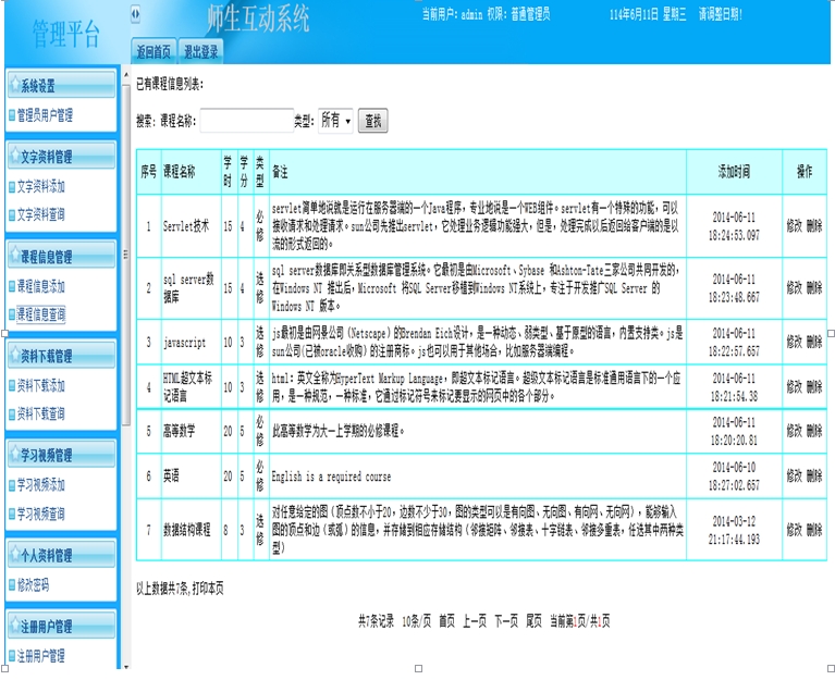 师生互动系统内容分为三个子系统:一个是教师功能子系统,一个是学生功能子系统,还有一个是超级管理员功能子系统。系统设计利用一些前沿优秀的教育学理论为指导,学习其他院校、公司的网络交互平台的设计优势,结合传统教学与现代教学的差异化要求,对平台的需求做出具体明确的归纳;在内容的判断、筛选和利用上,都按人才培养计划的目标进行,以互动学习为主,设计出决定性的平台功能模块。系统平台的实现,着力从技术层面角度出发,以JSP技术为主和其他一些关键技术的引用,运用SQL Server数据库。在软件平台的设计上,以交互式体验为指导,努力设计出美观简洁的平台界面。师生互动学习平台的建立与实现,有利于提高学生学习的积极性、主动性和创造性;也是跨越多种专业理论、技术和功能的一种尝试。