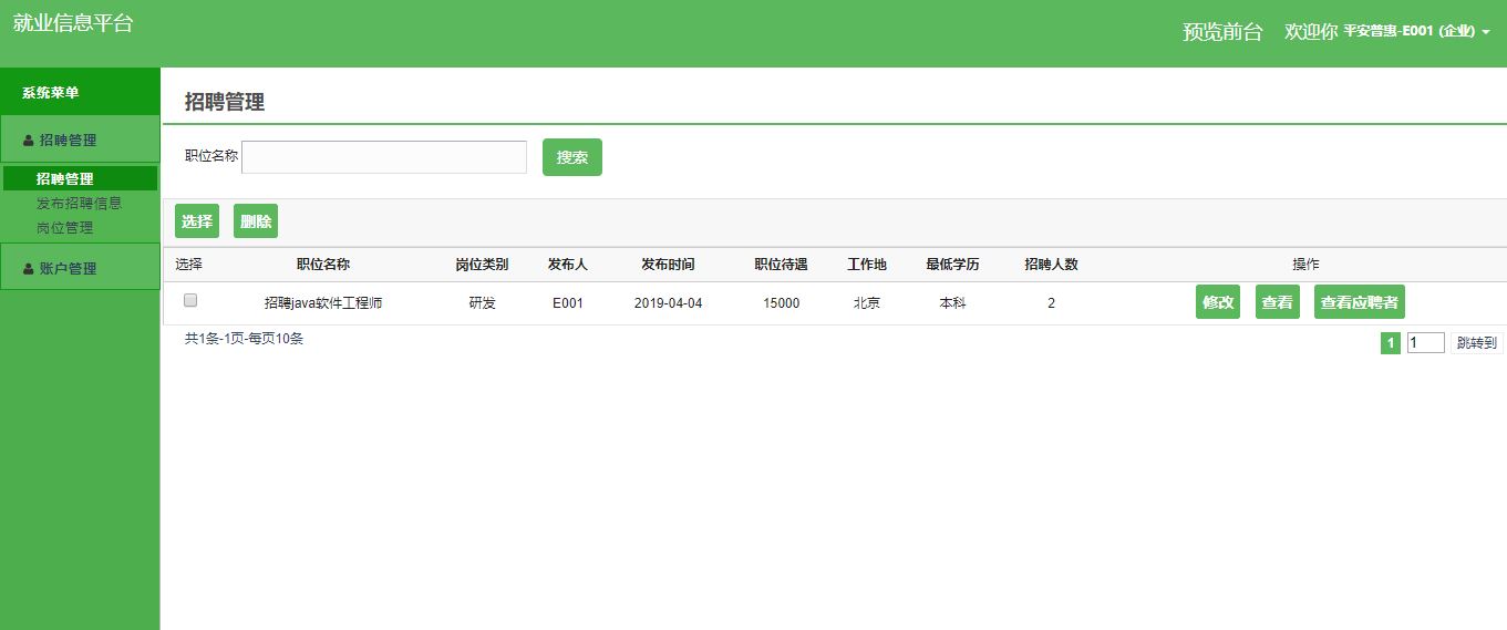 Key words: Employment Information Platform; JSP Technology; MYSQL Database; SSM Framework