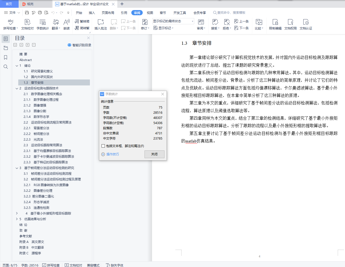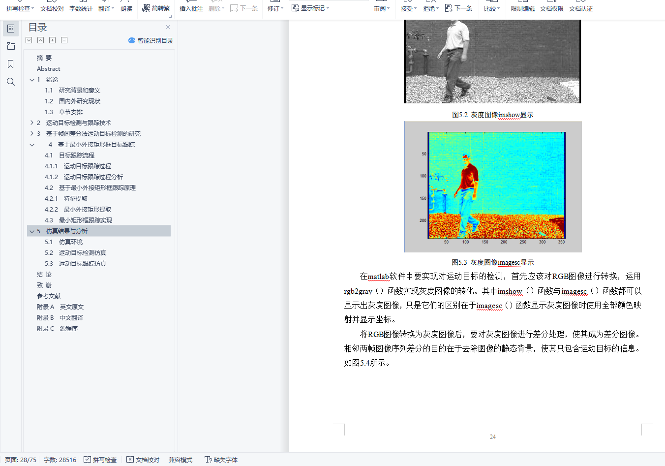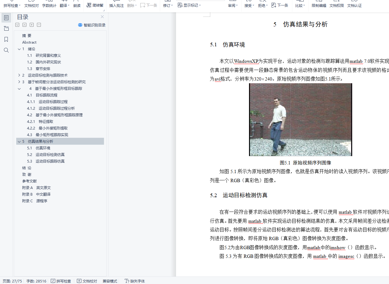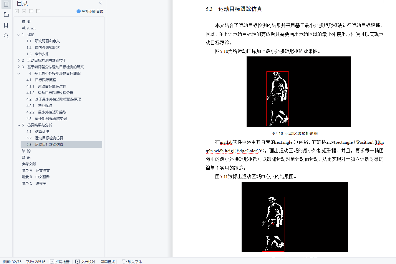 在采用了帧间差分检测法以及最小外接矩形框跟踪法基础上,用matlab软件对视频进行仿真,检测到了人体的轮廓,同时矩形框跟踪出了运动人体的轨迹,达到了运动目标检测与跟踪的效果。