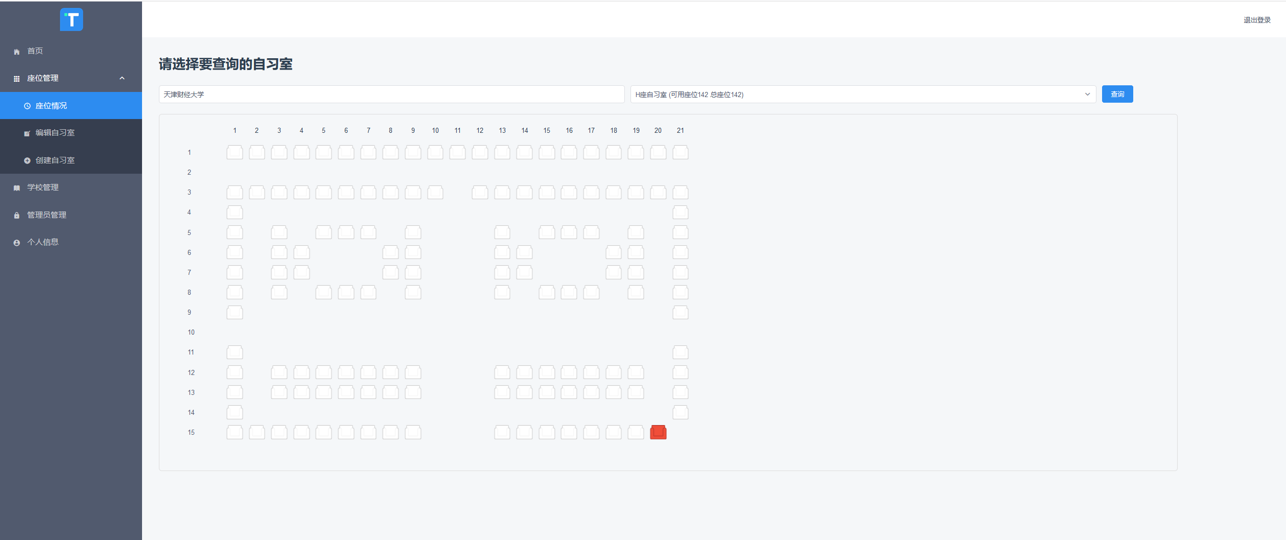 In order to solve the unreasonable phenomenon in the seat management of the study room of the university library, this paper investigates and analyzes the actual situation of the seat resource allocation management in the library of the new campus of Central South University. A set of library seat inquiry and reservation management system is designed and developed to provide more humanized service for library users.