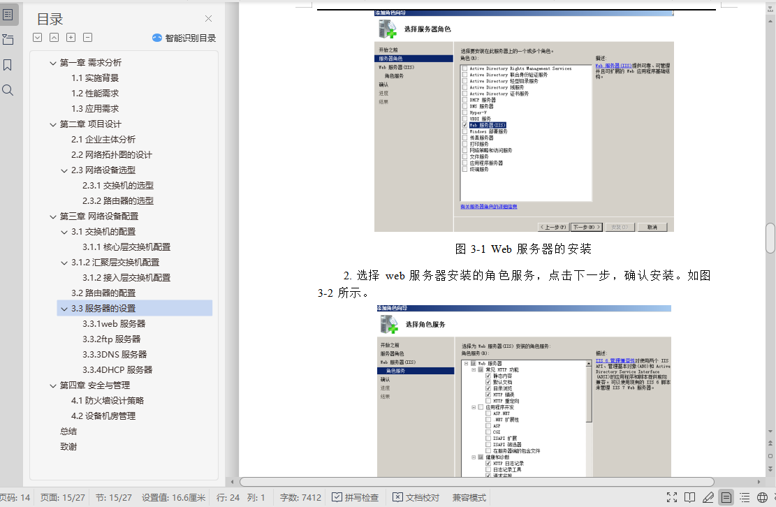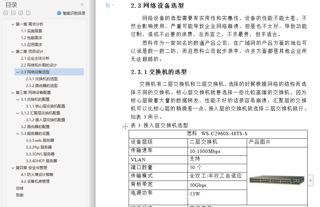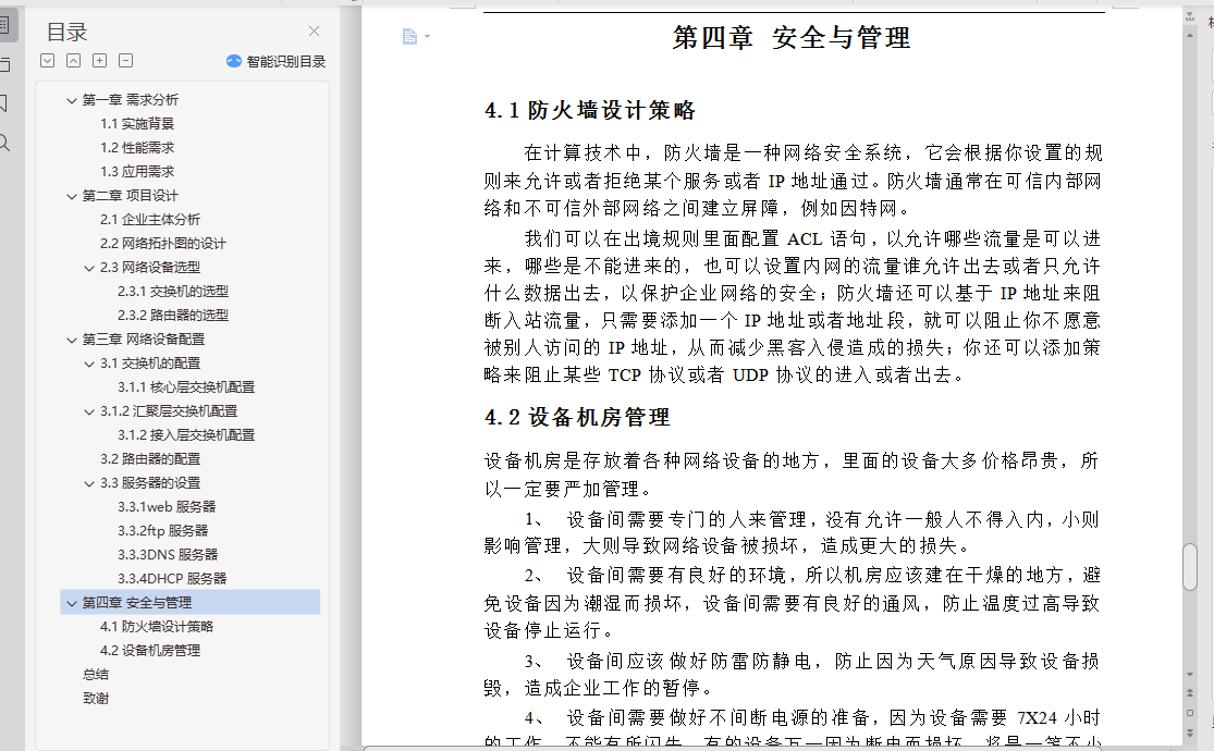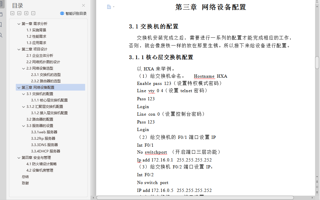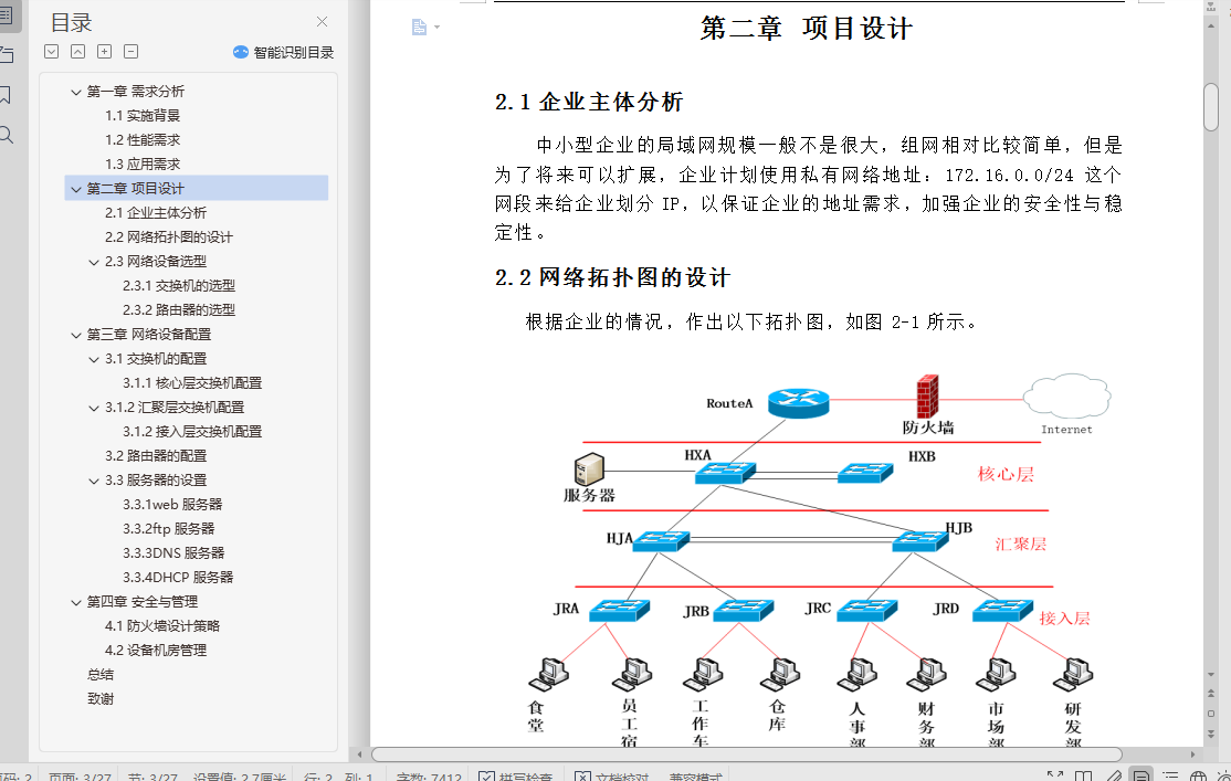 目录第一章 需求分析 ......................................................................... - 1 -1.1 实 施 背 景 ............................................................................. - 1 -1.2 性 能 需 求 ............................................................................. - 1 -1.3 应 用 需 求 ............................................................................. - 1 -第二章 项目设计 ............................................................... - 2 -2.1 企 业 主 体 分 析 ...................................................................... - 2 -2.2 网 络 拓 扑 图 的 设 计 ............................................................... - 2 -2.3 网 络 设 备 选 型 ...................................................................... - 4 -2.3.1 交 换 机 的 选 型 ............................................................ - 4 -2.3.2 路 由 器 的 选 型 ............................................................ - 6 -2.3.3 服 务 器 的 选 型 ............................................................ - 6 -2.3.4 防 火 墙 的 选 型 ............................................................ - 7 -第三章 网络设备配置 ................................................................ - 8 -3.1 交 换 机 的 配 置 ...................................................................... - 8 -3.1.1 核 心 层 交 换 机 配 置 ...................................................... - 8 -3.1.2 汇 聚 层 交 换 机 配 置 ...................................................... - 9 -3.1.2 接 入 层 交 换 机 配 置 .................................................... - 11 -3.2 路 由 器 的 配 置 ............................................................... - 12 -3.3 服 务 器 的 设 置 .................................................................... - 13 -3.3.1 web 服务器 ................................................................ - 13 -3.3.2 ftp 服 务 器 ................................................................. - 16 -3.3.3 DNS 服 务 器 ............................................................... - 18 -3.3.4 DHCP 服 务 器 ............................................................ - 21 -第四章 安全与管理 .................................................................. - 23 -4.1 防 火 墙 设 计 策 略 ................................................................ - 23 -4.2 设 备 机 房 管 理 .................................................................... - 23 -总结 .............................................................................................. - 24 -参考文献 ..................................................................................... - 25 -致谢 .............................................................................................. - 26 -