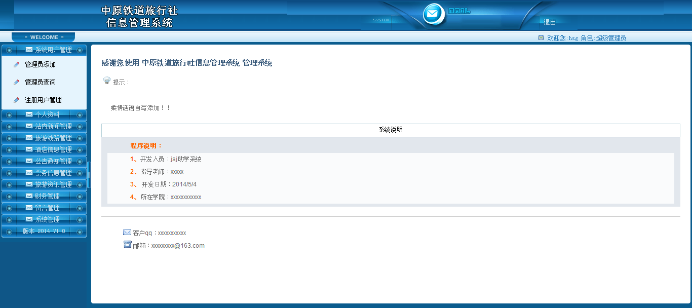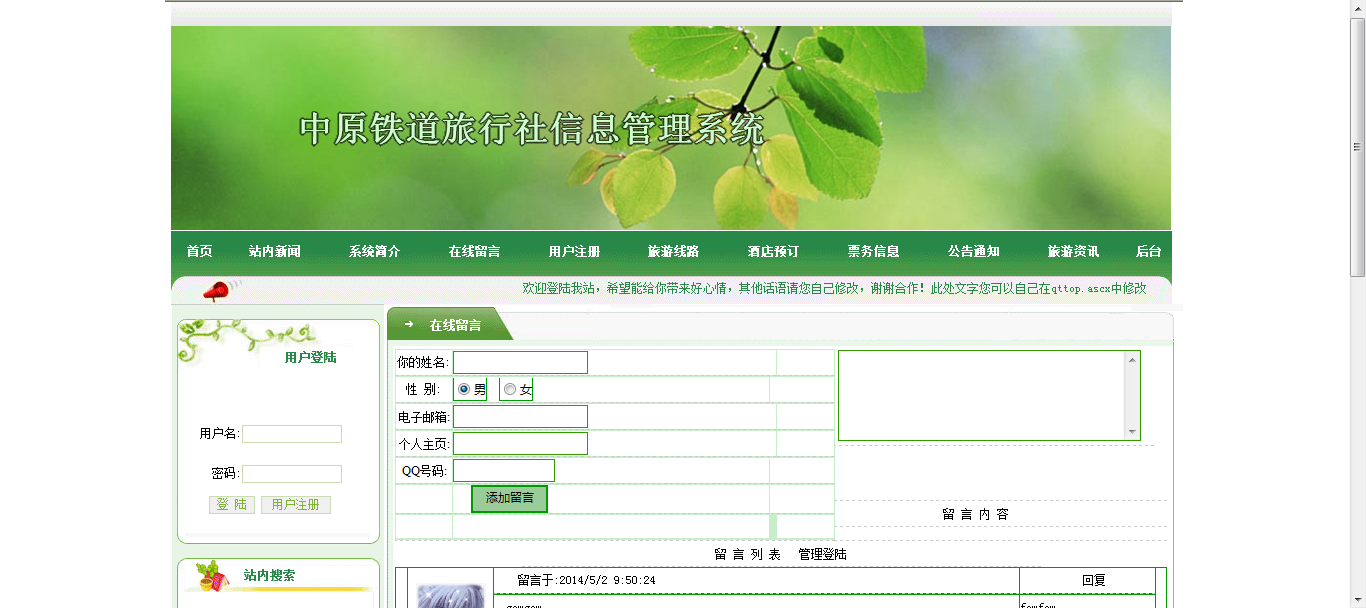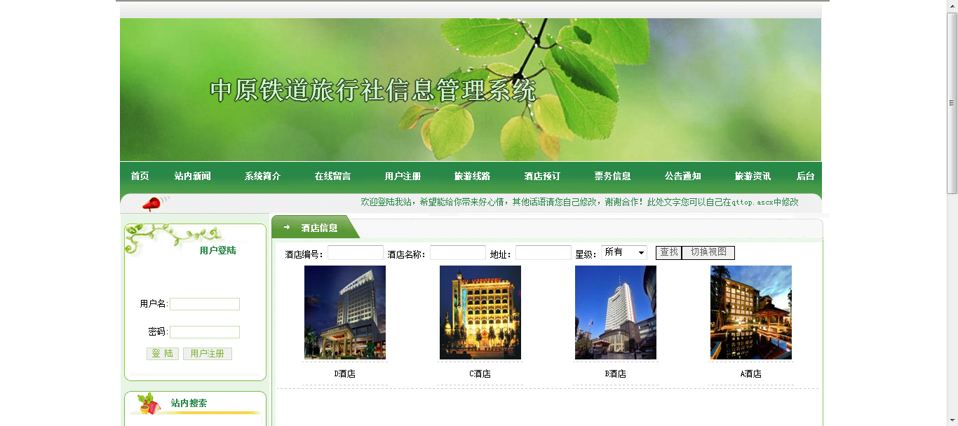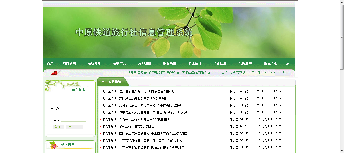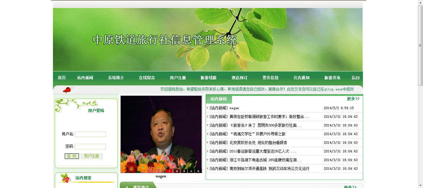 Tourism management information systems major web development tools with Visual Studio.NET, SQL Server 2005 backend database development tools. ASP.NET and C # language, SQL Server 2005 database technology to complete the system. Its main function of travel selected routes, scheduled group travel, online booking, accommodation recommended attractions recommendation. Its main function of travel selected routes, scheduled group travel, online booking, accommodation recommended attractions recommendation. This system is designed using three-tier architecture, Web Service technology, so that in the selection of platforms, using technically advanced, forward-looking scalability, in order to ensure the completion of the system has good stability, and scalability. The system design according to the standardized, hierarchical design, component-based implementation. The software component development, system architecture stratification, business and achieve separation, the separation of logic and data; as the core of a unified service interface specification, the use of open standards. Function, the system is relatively complete, the system Web interface and user interaction, provide users with information and accept its operation, the database management system to store data. System information and data browsing, query, edit and manage basic database operations, using a modular design approach, based on user requirements and procedures for application and ease of maintenance, each part placed in different modules facilitate the expansion and maintenance of the program, establish the basis for the reuse program features.