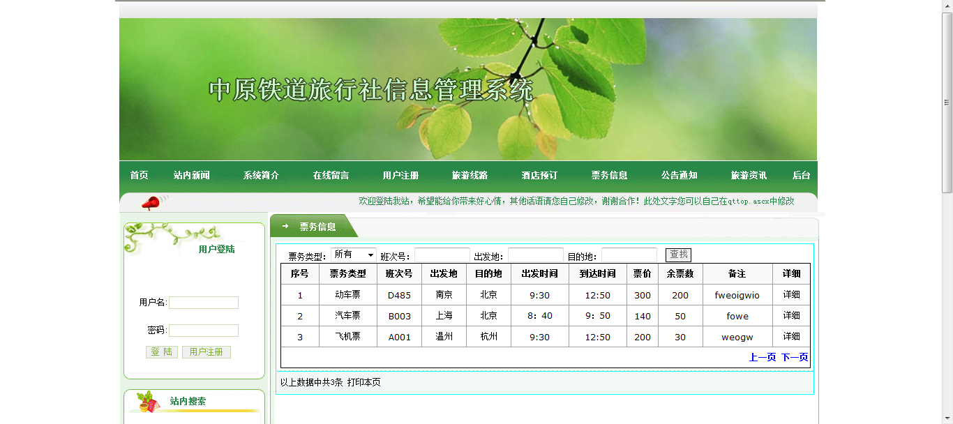 本旅游管理信息系统主要以Visual Studio.NET为主要的网络开发工具,以SQLServer 2005为后台的数据库开发工具。采用ASP.NET技术和C#语言SQL Server 2005数据库技术来完成该系统。其主要功能有旅游精选路线、定团旅游、在线订票、住宿推荐、景点推荐等功能。其主要功能有旅游精选路线、定团旅游、在线订票、住宿推荐、景点推荐等功能。此系统设计上采用三层结构、Web Service技术,使之在选用平台、采用技术上具有先进性、前瞻性、扩充性,从而保证建成的系统具有良好的稳定性、可扩充性。系统设计按标准化、规范化,分层设计,构件化实现。采用软件构件化的开发方式,使系统结构分层,业务与实现分离,逻辑与数据分离;以统一的服务接口规范为核心,使用开放标准。从功能上来说,系统是比较完备的,系统以Web界面与用户交互,为用户提供信息并接受其操作,同时通过数据库管理系统来存储信息数据。系统实现了对信息数据的浏览、查询、编辑和管理等基本数据库操作,采用了模块化设计方法,根据用户的需求及程序的应用与维护的易用性,将各个部分置于不同的模块当中,方便了程序的扩展与维护,同时建立了程序功能复用的基础。