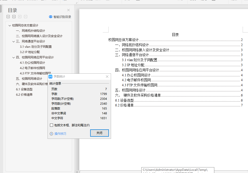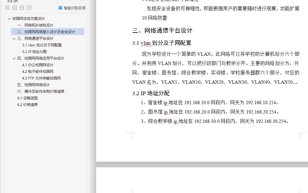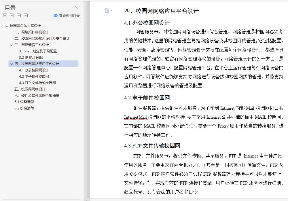 目录校园网总体方案设计 2一、网络拓扑结构设计 2二、校园网网络接入设计及安全设计 3三、网络通信平台设计 33.1 vlan划分及子网配置 33.2 IP地址分配 3四、校园网网络应用平台设计 44.1办公校园网设计 44.2电子邮件校园网 44.3 FTP文件传输校园网 4五、校园网网络设计 4六、 硬件及软件采购价格清单 66.1设备选型 66.2价格清单 7