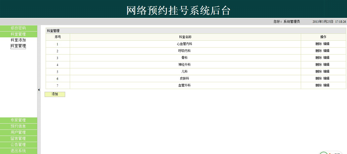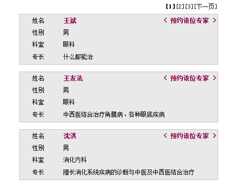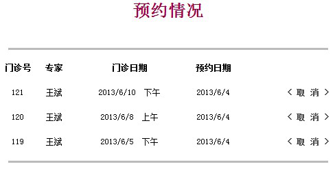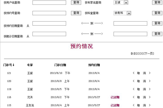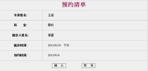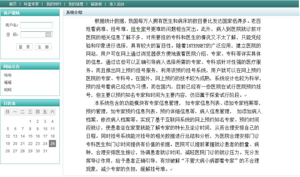 This system is divided into user and administrator role. The user is registered, login, departments and expert information browsing, registration, message and other operations. The administrator of the department management, expert management, user management, order management, message management, bulletin management operation. The development of this system includes two aspects of the development of database creation and maintenance, and front-end application. The former requirement to establish data consistency and integrity, security good database. For the latter requires the development of the system provides friendly man-machine interface, data can be input, query, modify, sorting and other functions.