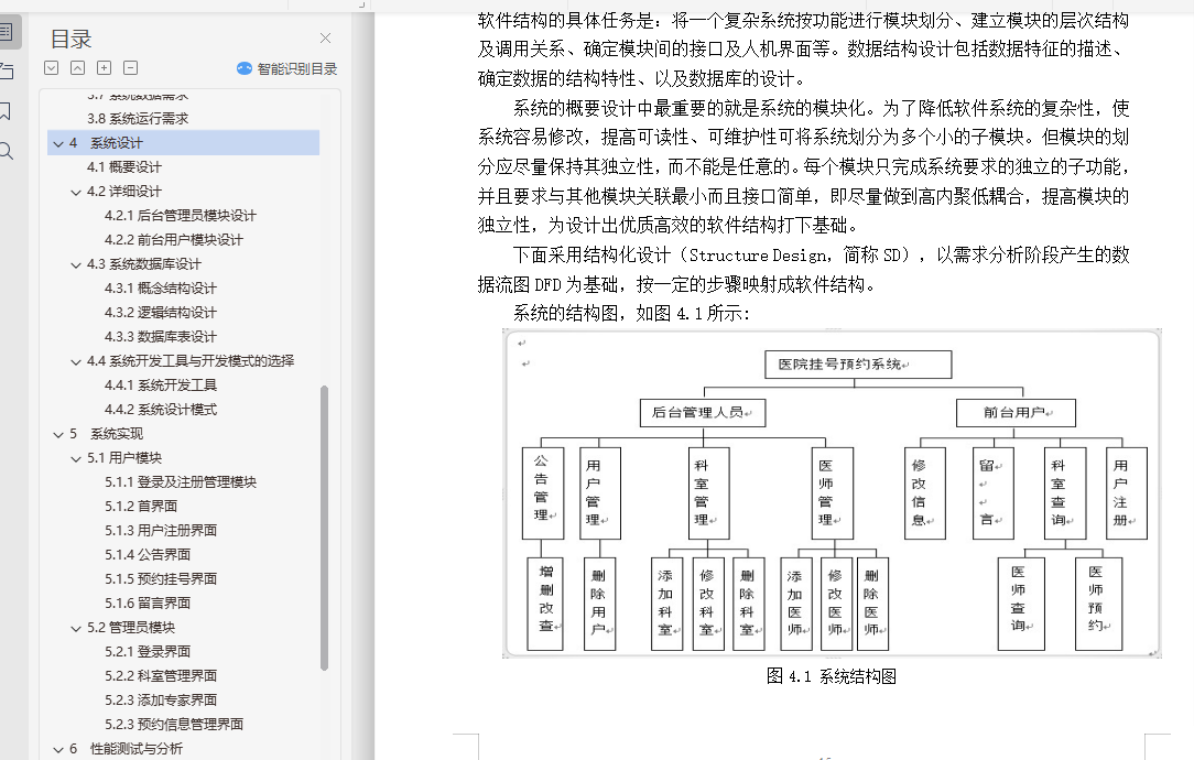 本系统的参与角色分为用户和管理员。前台用户主要进行注册、登录、科室及专家信息浏览、预约挂号、留言等操作。后台管理员主要进行科室管理、专家管理、用户管理、预约管理、留言管理、公告管理等操作。该系统的开发包括后台数据库的建立、维护和前台应用程序的开发两个方面。前者要求建立起数据一致性和完整性强、安全性好的数据库。而对于后者则要求开发的系统提供方便友好的人机对话界面,可以进行数据的录入、查询、修改、排序等功能。