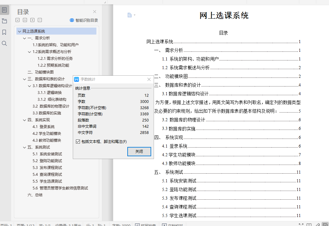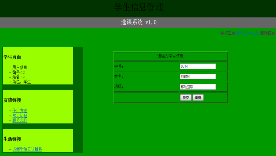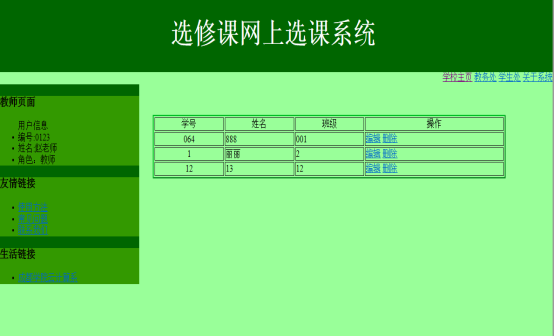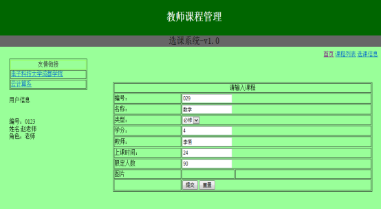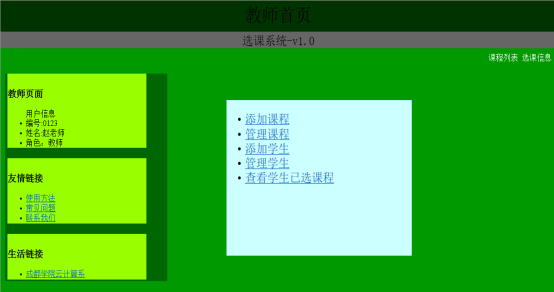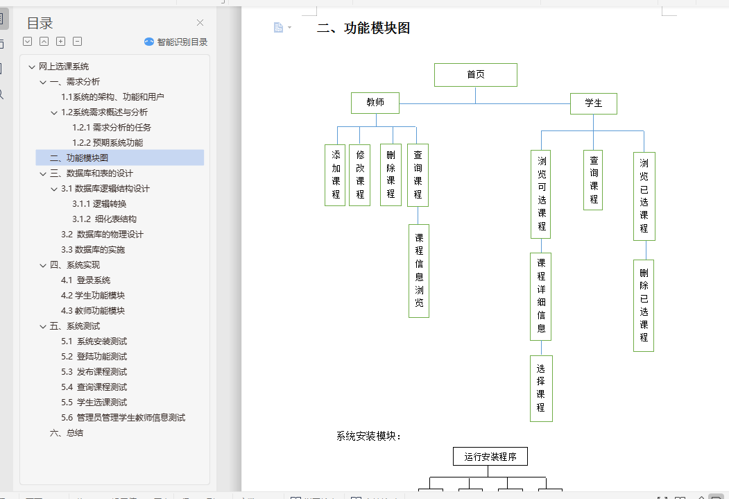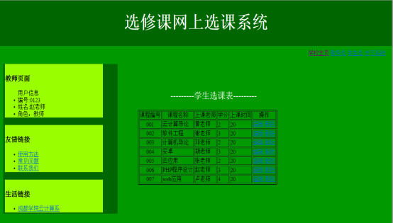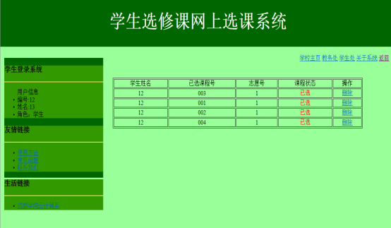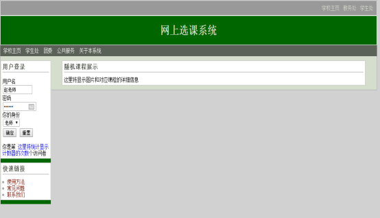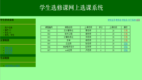网上选课系统目录网上选课系统 1一、 需求分析 11.1 系统的架构、功能和用户 11.2 系统需求概述与分析 2二、 功能模块图 2三、 数据库和表的设计 43.1数据库逻辑结构设计 4为方便,根据上述文字描述,用英文简写为表和列取名,确定列的数据类型及必要的约束规则,给出如下所示数据库表的基本结构及说明: 53.2 数据库的物理设计 63.3数据库的实施 6四、 系统实现 64.1 登录系统 64.2学生功能模块 74.3教师功能模块 8五、 系统测试 115.1 系统安装测试 115.2 登陆功能测试 115.3 发布课程测试 115.4 查询课程测试 115.5 学生选课测试 115.6 管理员管理学生教师信息测试 11六、 总结 12一、需求分析1.1系统的架构、功能和用户“网上选课”的功能从用户角度上分为两个层面:⑴使用该系统的学生,他们登录系统后通过客户端浏览器浏览可选课程的信息,并根据自己的实际情况按照一定意愿次序选课;⑵另一个是教师,他们可以通过客户端浏览器进行一些系统管理和维护工作,例如对课程信息进行添加、修改和删除等。⑶该系统应该是建立在B/S结构上的动态Web应用,还需按照学校的规模条件,以及学生集中选课的时间,根据预期系统性能选定服务器、相应的软硬件和网络设施。