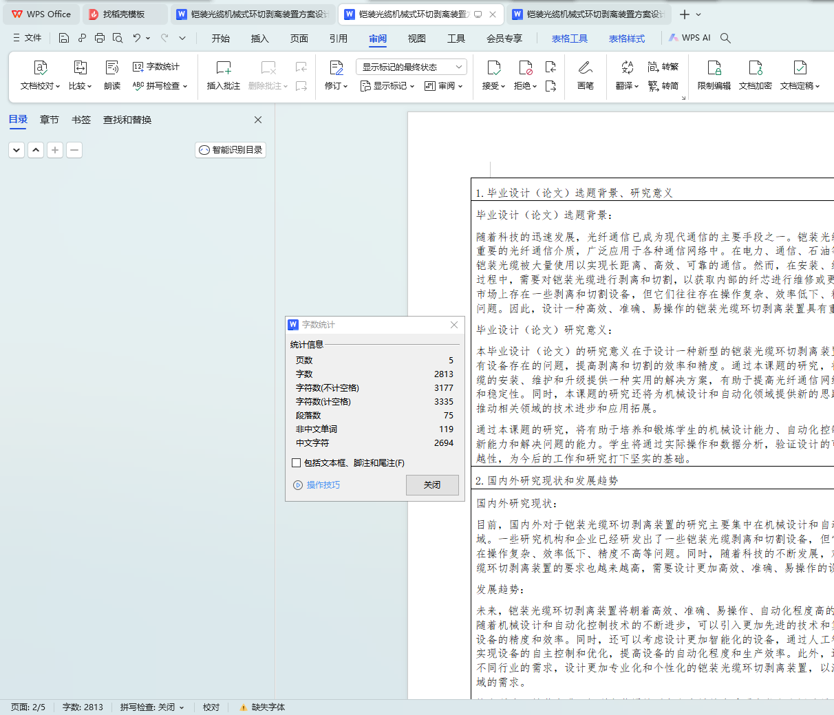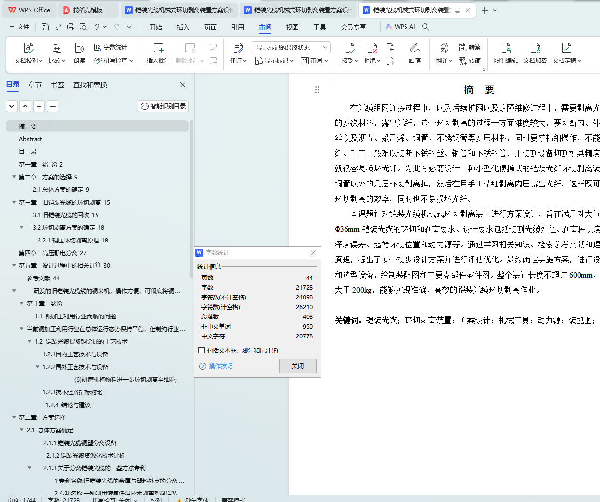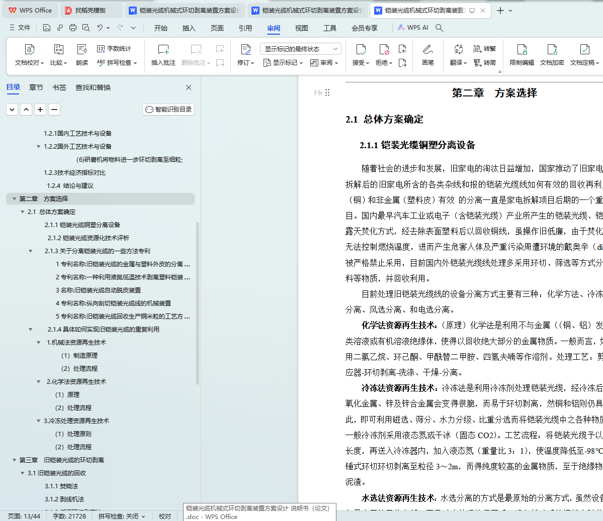 本课题针对铠装光缆机械式环切剥离装置进行方案设计,旨在满足对大气环境下Φ36mm铠装光缆的环切和剥离要求。设计要求包括切割光缆外径、剥离段长度、环切深度误差、起始环切位置和动力源等。通过学习相关知识、检索参考文献和理解设计原理,提出了多个初步设计方案并进行评估优化。最终确定实施方案,进行设计计算和选型设备,绘制装配图和主要零部件零件图。整个装置长度不超过600mm,重量不大于200kg,能够实现准确、高效的铠装光缆环切剥离作业。