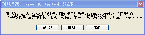 We have adopted hook technology in the Trojan horse design process, which joint with the nearly stage’s QQ Trojan horse hides and dissemination technology, So, the check and kill QQ Trojan horse system based on that technology is suitable to check and kill prevailing QQ Trojan horse at present.