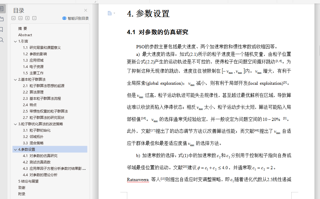 粒子群优化是一种新兴的基于群体智能的启发式全局搜索算法,粒子群优化算法通过粒子间的竞争和协作以实现在复杂搜索空间中寻找全局最优点。它具有易理解、易实现、全局搜索能力强等特点,倍受科学与工程领域的广泛关注,已经成为发展最快的智能优化算法之一。论文介绍了粒子群优化算法的基本原理,分析了其特点。论文中围绕粒子群优化算法的原理、特点、参数设置与应用等方面进行全面综述,重点利用单因子方差分析方法,分析了粒群优化算法中的惯性权值,加速因子的设置对算法基本性能的影响,给出算法中的经验参数设置。最后对其未来的研究提出了一些建议及研究方向的展望。