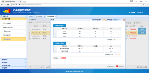 本课题主要解决的问题有:(1)车辆接待:系统需要实现添加来访者以及其车辆的信息,进行开单操作,并为维修单分配维修人员和质检人员。(2)维修项目登记:维修人员维修检查,登记维修用料和维修工时的情况。(3)维修领料:维修人员人员领取维修材料。(4)质检完工:质检员进行质检,录入质检结果到系统中。(5)消费结算:查询维修单,进行付款操作。(6)配件管理:工作人员管理配件的信息。