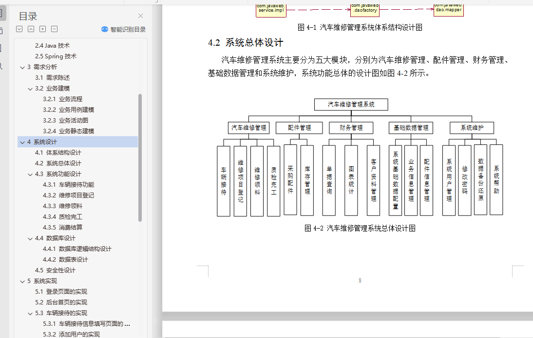 本文首先介绍了汽车维修管理的课题研究的背景,当前发展的现状和面临的问题。接着介绍了本次课题所用到的技术。然后是需求分析,使用面向对象的思想方法结合UML分析建模工具来完成。然后介绍了系统的设计部分,详细说明了系统的业务逻辑和具体的实现方法。描述了系统的数据库设计。还介绍了系统的具体实现部分。本系统使用SMM框架来实现,页面使用EasyUI来完成。最后介绍了系统的测试部分,选取了一部分功能进行测试。