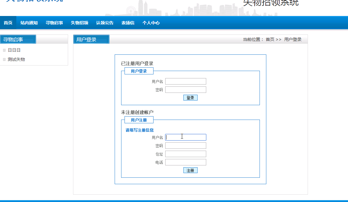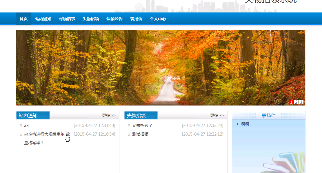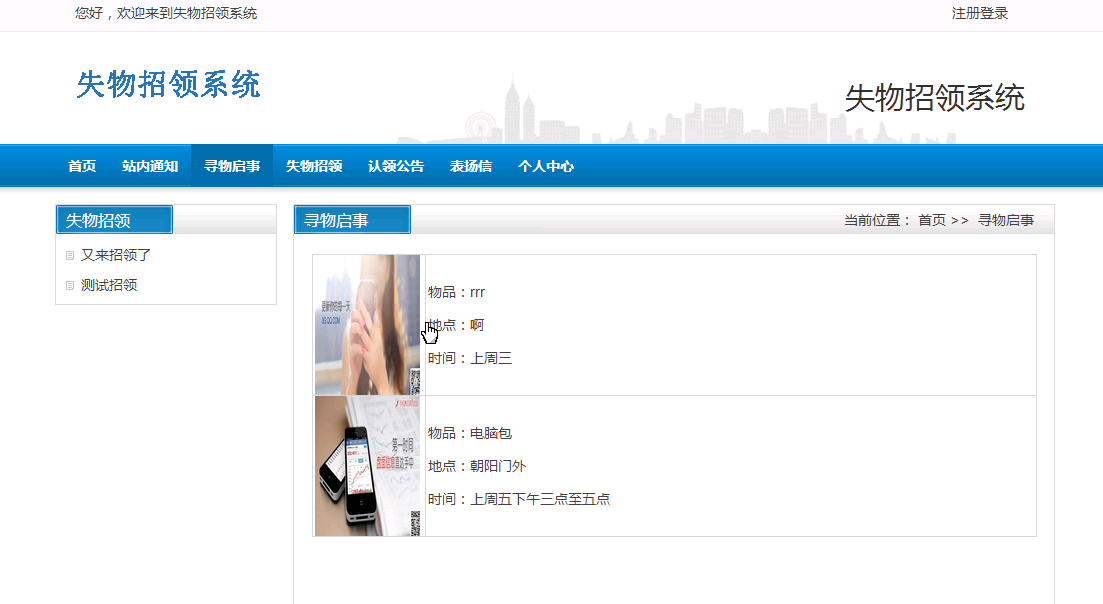 摘要:失物招领系统是鉴于现今我国现状,为了帮助更多的人更加方便快捷得找回他们丢失的物品而设立的一个平台。在这个网络日益发展的时代,网上寻物成为最简单方便的方式,只需要坐在家里就可以清清楚楚地知道自己丢失物品的情况。基于目前国内该系统也是初步投入使用,在功能和应用方面还有待完善,我们加入自己的新点子,这个系统在以后应该会得到广泛的应用并日臻完善。该项目的主要用户包括一些学校,政府机关和大型企业等。