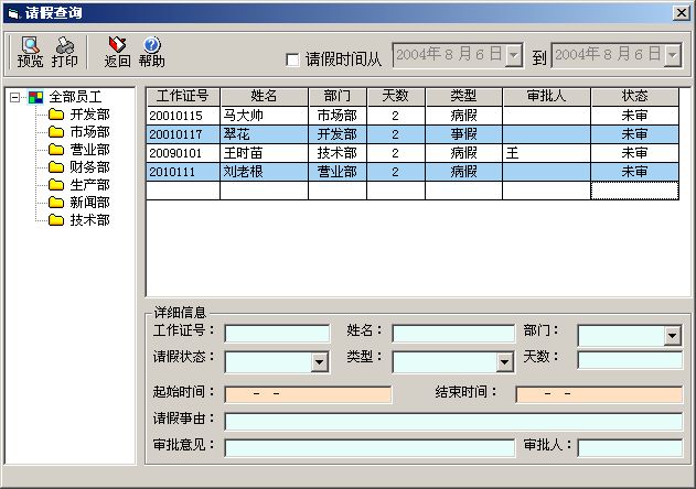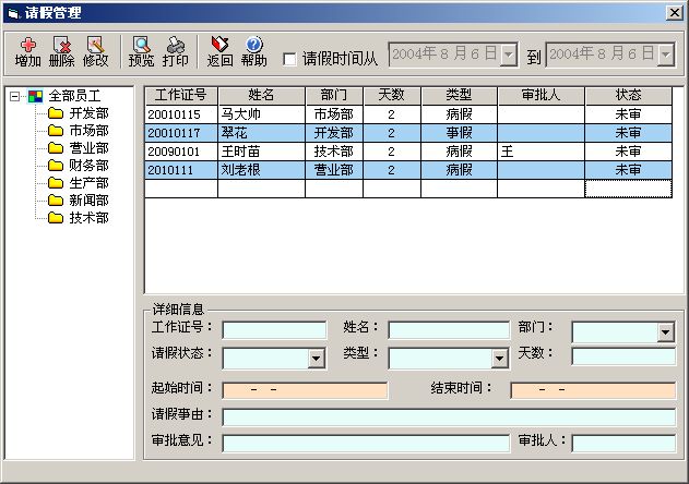 At present, most of the unit's management staff to take leave or part of the manual management, low efficiency and timely statistics and query staff leave, and other information, can better adapt to the current management of the unit. Management manual still many shortcomings, the inevitable result of human factors, resulting in missing data, and false positives. Computer Information Management has a large storage capacity, speed and many other advantages, give us the information in a timely manner to deal with fast, so we use a computer to provide information to our employees leave the management of the process of forming a set of dynamic management.
