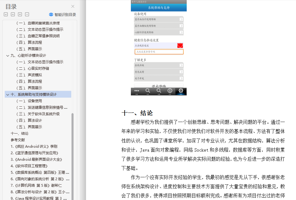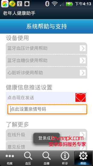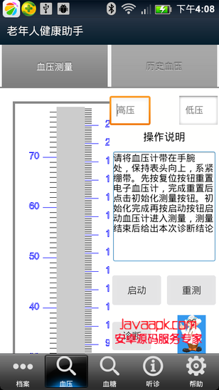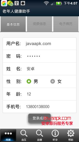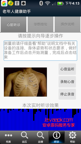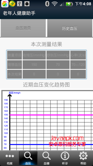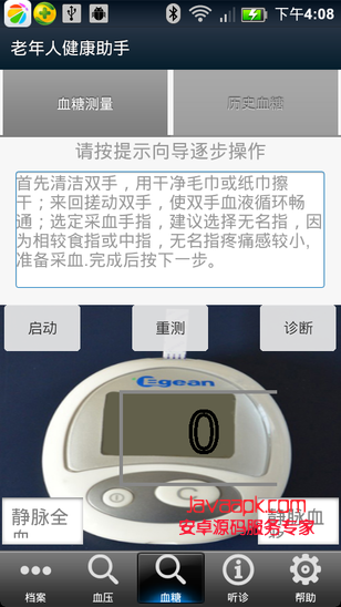 基于Android的移动医疗终端系统由Android手机端应用软件和硬件测量设备构成,主要面向居家养老的老年群体心脑血管疾病、糖尿病监测和健康护理方面。使用本系统可以足不出户,居家方便快速检测血压、血糖指标,自助进行心脏听诊。一方面这些测量所得的健康数据可以被推送到指定的远程医疗机构或社区卫生服务站,医生专家们依此对老年人建立长久的电子医疗档案,以便远程分析监控或就医治疗;另一方面,终端也可根据测量数据智能分析辅助诊断,如血压异常,心脏听诊音异常等,并将这些数据绘制成趋势图表统计近期健康状况;特别的终端还加入亲情关怀功能,将测量的健康数据以短信的形式定时发送到指定的家属手机上,便于监护人及时监测关注老人们的健康状况。考虑到老年群体们的使用习惯,系统在界面上进行了特别设计,如字体较大,操作简单,提供大量的使用帮助。系统主要功能包括血压检测、血糖检测、心脏听诊录音、相关健康信息收集等模块,主要使用的技术有AndroidUI设计、SQLite轻量级数据库存储健康信息、Android蓝牙通信协议及数据传输、图形绘制、摄像头采集图像加工和存储、声音媒体信息处理、软件工程管理等技术。