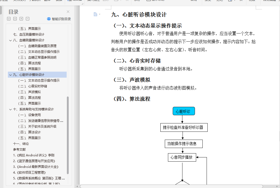 Mobile medical terminal system based on the Android device is measured by the Android mobile terminal application software and hardware composition, main house oriented elderly heart cerebrovascular disease, diabetes, monitoring and health care.Using this system can never leave home, convenient and rapid detection of blood pressure, blood sugar index that occupy the home, self-service for heart auscultation.On the one hand, the measurement of health data can be pushed to the remote medical institutions designated or community health service station, the doctor experts in this build long-term electronic medical records for the elderly, so that the analysis of remote monitoring or medical treatment;Intelligent terminal, on the other hand, can also according to measurement data analysis assisted diagnosis, such as the abnormal blood pressure, cardiac auscultation abnormal sound, etc., and these data into trend chart recent health statistics;Special terminal also joined the family care function, will measure the health of the data in the form of text messages sent to the families of the designated mobile phone, is advantageous for the guardian timely monitoring on the old people's health.Considering the use of the fact that the elderly system especially in interface design, such as font is bigger, the operation is simple, provide the use of a lot of help.Detecting system main functions including blood pressure, blood sugar, heart auscultation recording, related health information collection module, the main use of technology are AndroidUI design, SQLite lightweight database storage health information, Android bluetooth communication protocols and data transmission, graphics rendering, camera collection and image processing and information processing, storage, voice media technology of software engineering management, etc.