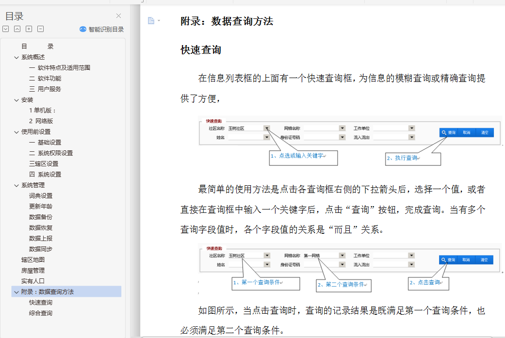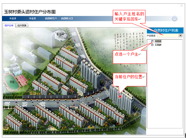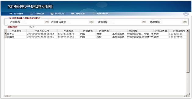 2 住户信息管理:对辖区内的住户基本信息、地理定位、住户人口信息等进行了管理,既可以按【乡镇】>【村委会】>【自然村】>【村民小组】>【门牌号】直到住户人口(以户找人)的级联方式查询人口,也可以按【人口】-【住户】….的方式(以人找户)查询住户或辖区信息。