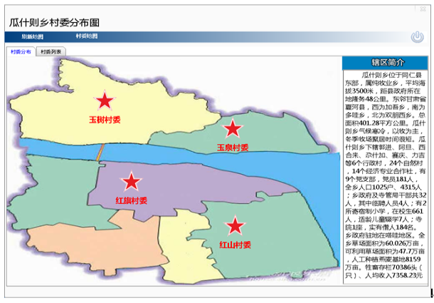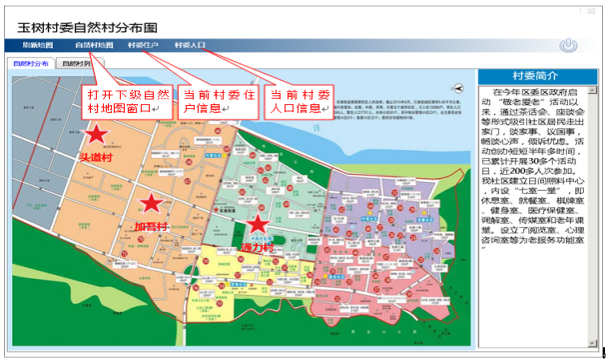 1 辖区信息管理:按【乡镇】>【村委会】>【自然村】>【村民小组】>【门牌号】的级联方式对辖区的基本信息进行管理,以地图(或示意图)的形式直观展示各级管理层的分布情况,以及住户、人口信息等。