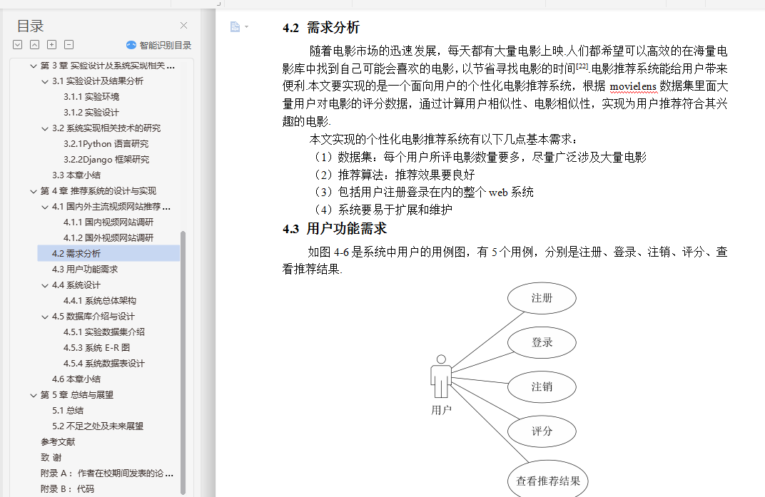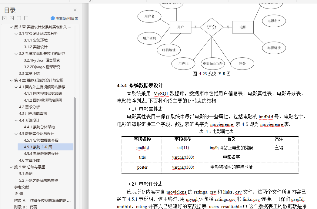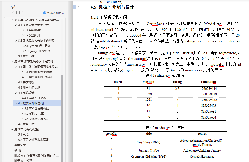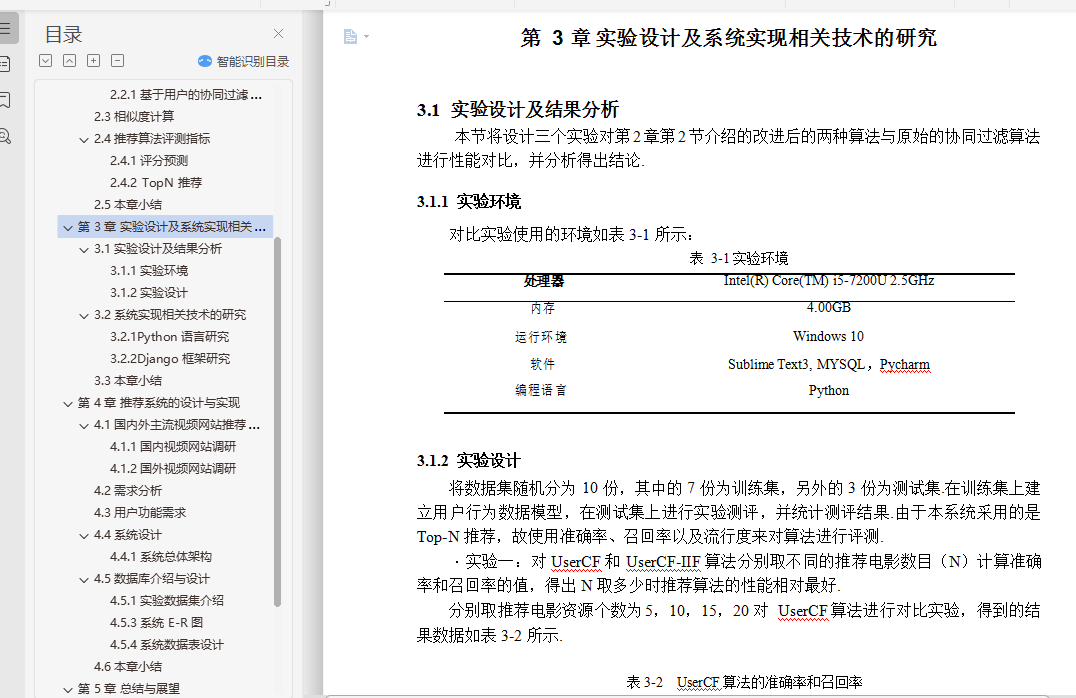 本系统包含电影前端展示界面、电影评分板块、推荐算法的实现以及后端数据库的设 计.其中实现推荐算法是整个电影推荐系统的核心.系统采用由grouplens项目组从美国著名 电影网站movielens整理的ml-latest-small数据集,该数据集包含了671个用户对9000多部电 影的10万条评分数据.首先将该数据集包含的全部文件经过筛选重组之后存储到建好的数 据库中,并将数据集按一定比例划分为训练集和测试集,对训练集进行算法分析生成Top-N 个性化电影推荐列表,然后在测试集上对算法进行评测,至少包括准确率和召回率两种评 测指标.