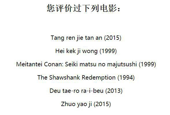 the database, and after the recommendation list is obtained, the result is fed back to the browser, and the movie poster picture stored in the database is retrieved for display.When the user clicks on the nickname that he or she login, he will jump to the page to show the movie he has already evaluated.