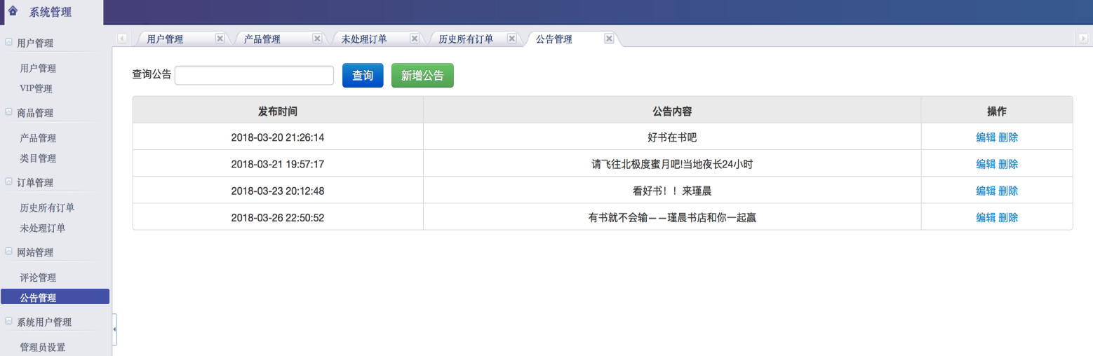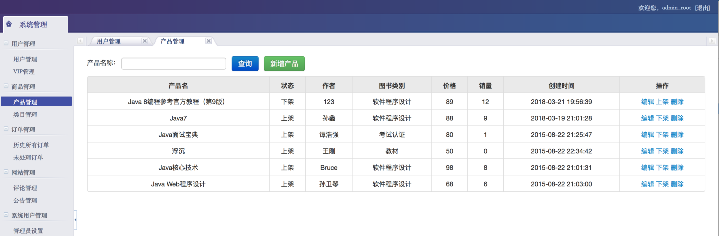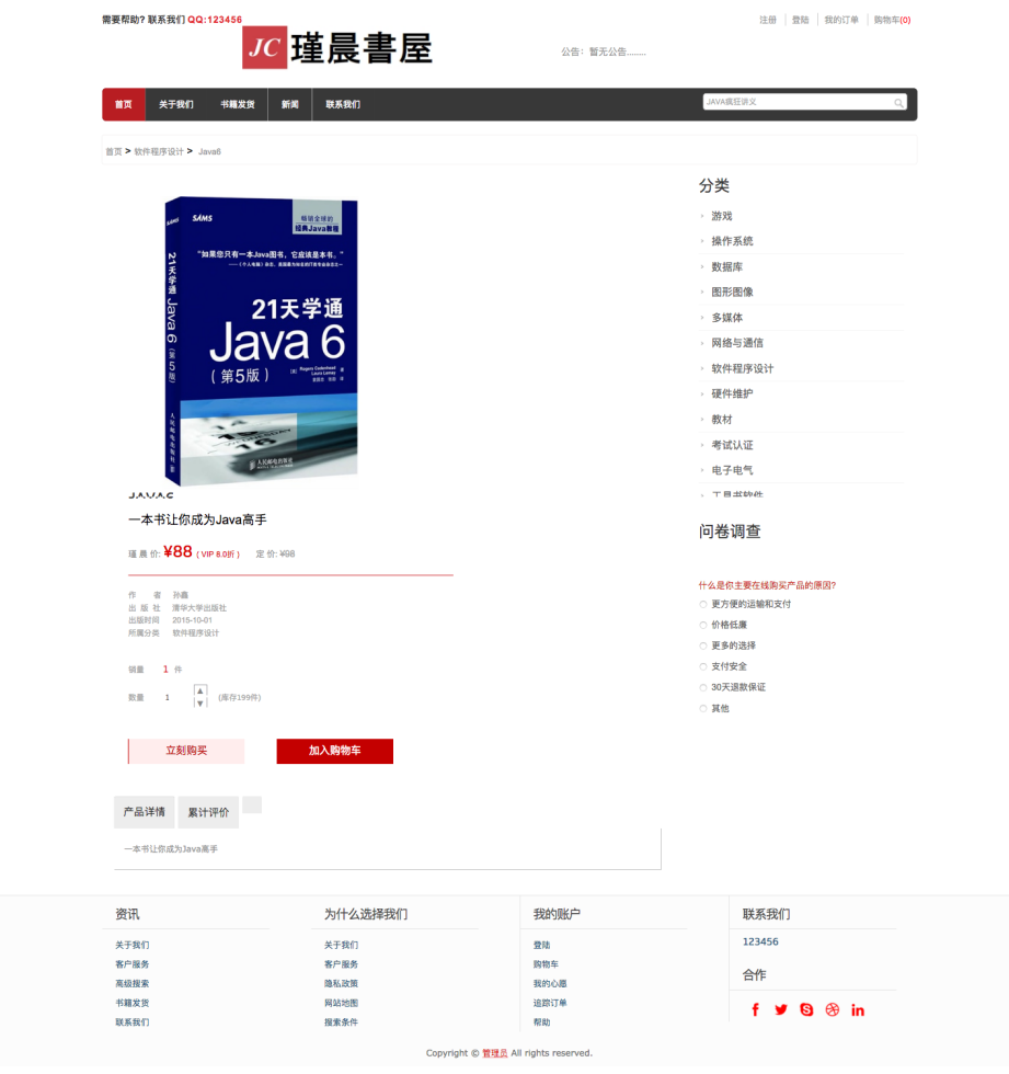 摘要:随着21世纪互联网的迅猛发展,电子商务改变了人们购物的方式,在线购物成为人们生活中重要组成部分。本购书网站采用JAVA技术开发,存储数据使用的数据库是mySQL数据库。网站分为前台和后台,前台功能有用户注册登录、商品浏览、订单管理、购物车管理、关键词搜索等功能,后台功能有商城用户信息管理、产品信息管理、订单信息管理、公告信息管理等功能。本网站减少了商品销售过程中的中间环节,为顾客提供了更加丰富和价格实惠的书籍选择,同时管理员也能在后台方便的进行网站的管理。网站UI美观,界面简洁,能够很好的展示内容,顾客和管理员的体验好,具有很强的实用性。