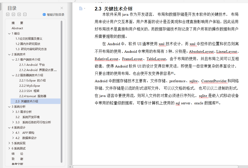 本设计客户端采用Android Studio+ADT+SDK+SQLite +JDK,服务端采用tomcat+myeclipse+mysql来实现。本软件采用java作为开发语言, 布局和数据存储是开发本软件的关键技术, 布局用来设计用户交互界面,用户界面的设计是否美观和合理直接影响用户体验,因此运用好布局技术是直接和用户相关的,而数据存储技术则记录了用户所有的操作数据和用户所需要提取的数据。