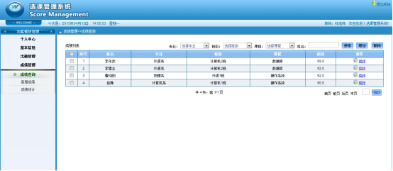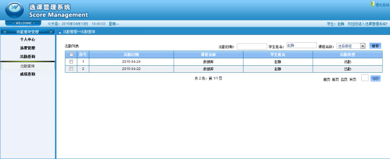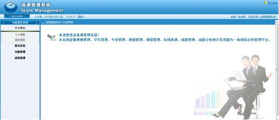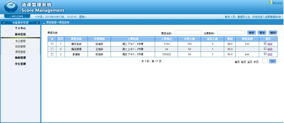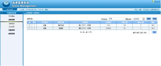 Online course selection system should include the basic functions including basic information such as teachers, students, administrator , student course selection and operation management of teachers. This system for students to provide personal information maintenance, course selection and check the information for the selected courses, attend and score, etc. For teachers to provide personal information maintenance, check their course information, registration function such as the students' attend and score. The administrator can treat all the students, teachers, curriculum, professional, class's and grade's basic information management, etc. This system based on MyEclipse development tools, the mysql database software. The JSP technology and B/S structure based on Web. Use of JSP, HTML web site overall style, interface design and development, Use SSH framework for the development of practical application, the background database. This system with reference to the some characteristics of the school course system, realized the basic functions related to course selection.