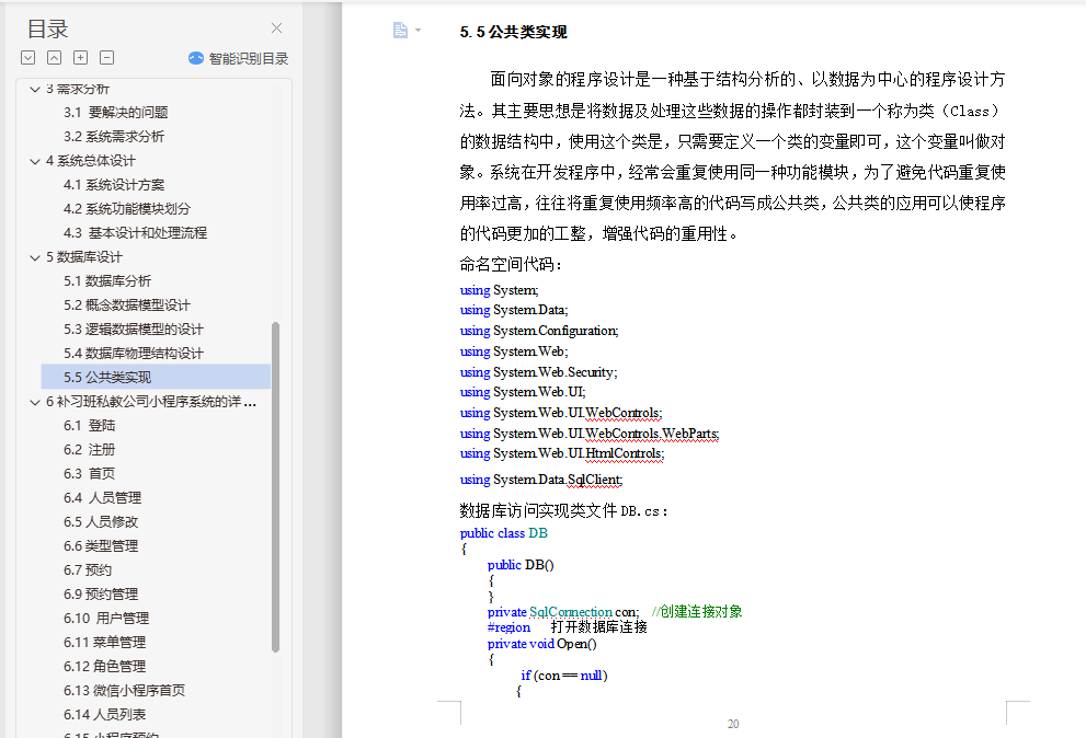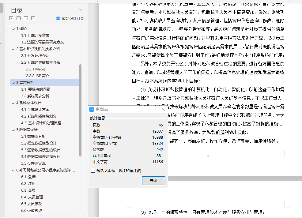 摘要:电子商务能够充分的利用小程序创立企业在电子商务中的竞争优势,基于电子商务的这一特点,我开发了补习班私教小程序系统。本补习班私教公司小程序系统发挥了网络优势,采用电子商务营销手段将私教企业推广出去,既保留了补习班私教的传统运作模式,又利用了计算机网络方便、快捷、实时性高的特点,开发出一个供私教求职和私教需求人员相互交流的平台。其开发主要包括后台数据库的建立和维护及前台应用程序的开发两个方面。对于前者要求具有一定的一致性和安全性,而对于后者则要求程序功能完备、易用性好等特点。本小程序的开发是以Eclipse为开发平台,采用JAVA为脚本开发语言,后台数据库采用MySQL,实现了私教行业信息浏览,供求信息资料注册,服务需求信息发布,小程序信息发布,以及小程序后台的多种管理功能。用户可方便地进行信息浏览,登录注册,发布需求信息等操作。本小程序后台管理员则进行添加、删除、更新相关信息以及根据需求条件实现客户与员工的需求匹配工作,以达到最好的匹配结果。关键词:补习班私教;电子商务;数据库;小程序设计目录1绪论 21.1系统开发背景 21.2选题的背景及研究意义 22基本知识及相关技术介绍 42.1开发环境介绍 42.2系统的关键技术介绍 42.2.1.MySql 42.2.2 JSP简介 43需求分析 53.1 要解决的问题 53.2系统需求分析 64系统总体设计 74.1系统设计方案 74.2系统功能模块划分 84.3 基本设计和处理流程 95数据库设计 115.1数据库分析 115.2概念数据模型设计 115.3逻辑数据模型的设计 125.4数据库物理结构设计 145.5公共类实现 196补习班私教公司小程序系统的详细设计 226.1 登陆 226.2 注册 236.3 首页 246.4 人员管理 256.5人员修改 256.6类型管理 266.7预约 276.9预约管理 276.10 用户管理 286.11菜单管理 296.12角色管理 296.13微信小程序首页 306.14人员列表 316.15小程序预约 326.16预约列表 336.17评价 347系统测试 357.1系统测试的方法 367.2系统详细测试过程 37结语 39参考文献 40致谢 41