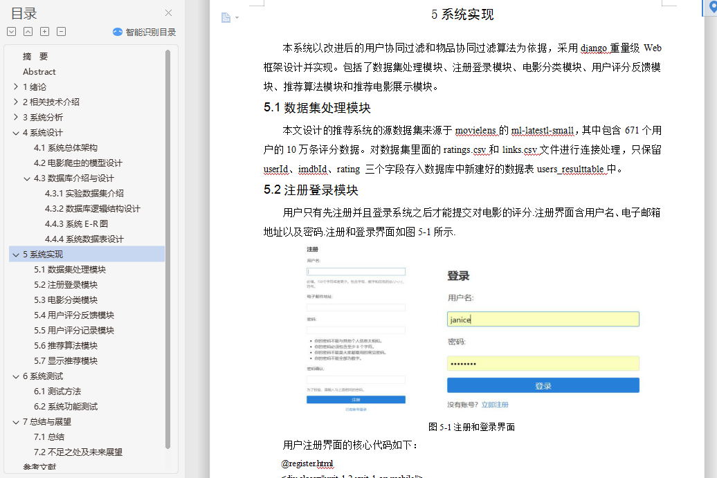 本系统包含电影前端展示界面、电影评分板块、推荐算法的实现以及后端数据库的设计。其中实现推荐算法是整个电影推荐系统的核心,系统采用爬虫技术和协同过滤算法,是推荐领域最出名也是应用最广泛的推荐算法。所以系统拟采用两种协同过滤算法给出两种不同的推荐结果,一种是基于用户的协同过滤算法,另一种是基于物品的协同过滤算法,用户可以根据两种推荐结果更加合理的选择合适的电影。系统采用了改进之后的ItemCF-IUF和UserCF-IIF算法,对计算用户相似度和物品相似度的计算都做出了改进。最后通过计算两种算法的准确率(Precision)、召回率(Recall)和流行度从而对系统进行评测、并比较了两种算法各自的优势和劣势。实验证明,改进后的算法比原始的协同过滤算法推荐效果要好,准确率更高。整个系统涉及到的编程语言包含Python、Html5、JQuery、CSS3以及MySQL数据库编程。用到的框架是Django重量级web框架,通过该框架连接系统的前、后端.用户首先需要 填写用户名、密码以及邮箱注册系统,然后才能登陆推荐系统。