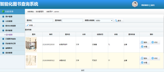 随着网络技术的发展、计算机应用水平的提高的扩大,原来系统的时效性、数据的正确性、操作的方便性上都存在不足,已影响到系统的正常使用。经过考察比较,决定利用自己的力量对智能化图书查询系统重新设计,使系统能利用软件开发技术的成果,方便图书的管理。 智能化图书查询系统是典型的信息管理系统,本文系统地介绍了智能化图书查询系统开发所需要用到的技术,和设计中遇到的问题及解决方法以及提高当前应用程序的工作性能。 利用各种面向对象的开发工具,首先在短时间内建立系统应用原型,然后对初始原型系统进行需求迭代,不断修正和改进,直到形成用完整的可行系统。 本次毕业设计利用MyEclipse开发工具和MYSQL数据库来开发这个智能化图书查询系统,使用SSM结构框架,用到了JSP、javascrip等前端技术,该系统要解决提高图书管理效率的问题以及为顾客与读者提供便利的图书检索方式,可以满足图书管理基本要求,包括添加、管理、查询、推荐等功能。该系统能根据用户的需求,快捷方便的为读者提供查询检索与借阅服务。
