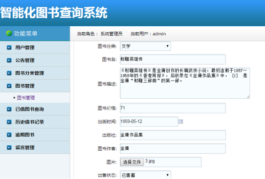 With the development of network technology, computer application level of the expansion of the efficiency of the original system, the correctness of the data, the convenience of operation are insufficient, has affected the normal use of the system.After inspection comparison, decided to use their power to intelligent book query system, the system can use the software development technology the achievement, convenient for the management of the books.Intelligent book query system is a typical application of managing information system, this paper systematically introduces the intelligent book query system development need to use the technology, and the problems in the design and the solution and improve the performance of the current application.Use a variety of object-oriented development tools, first of all, establish a system application prototype in a short time, and then to the initial prototype system needs iteration, constantly revised and improved, until the feasible system formed in full.The graduation design using the MyEclipse development tools and MYSQL database to develop the intelligent query system, using SSM framework structure, use the JSP, javascript, such as front-end technology, the system to solve the problem of improving the efficiency of book management, and provide convenience for customers and readers of books retrieval way, can satisfy the books management essential requirements, including adding, management, query and recommendation, etc.The system can according to user requirements, fast and convenient provide query retrieval and borrowing service for readers.