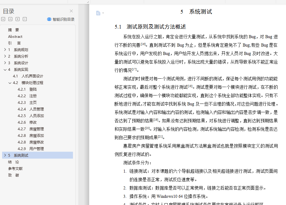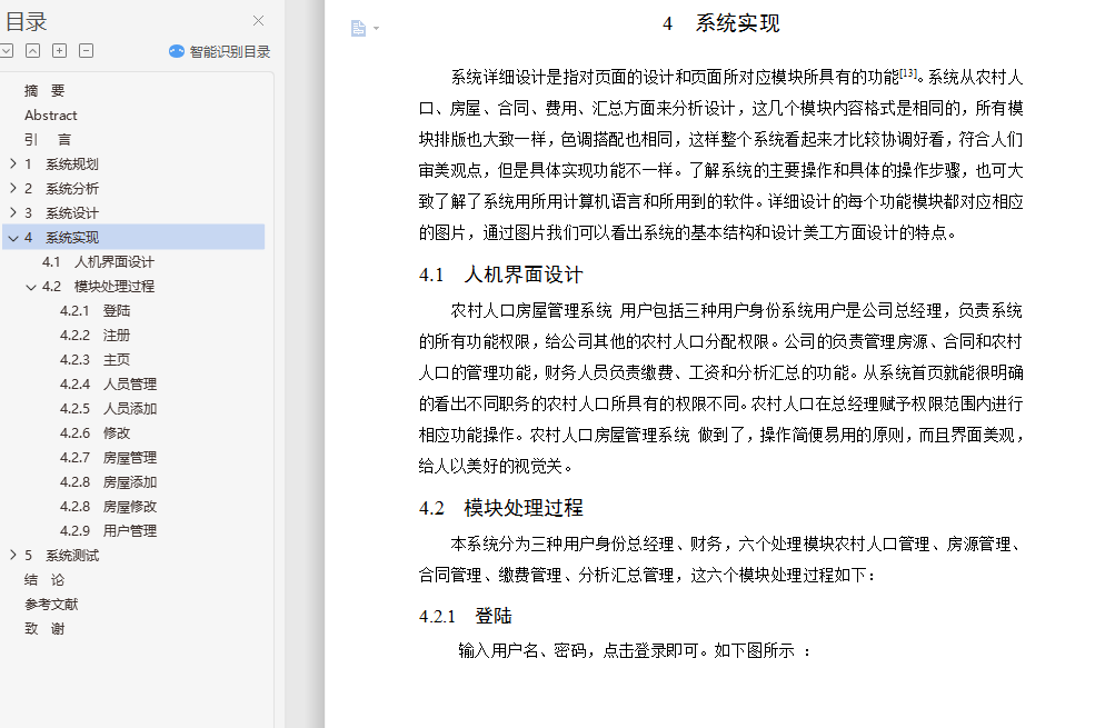 本系统实现了农村人口房屋管理系统对房源分析汇总的管理,在系统投入运营前实现了所需的各个功能。系统能够正常投入运营,可以为农村人口房屋管理系统提高经济效益,使之适应现代化社会的发展。