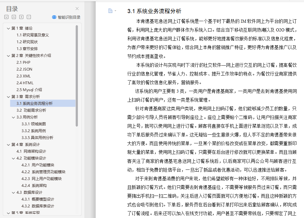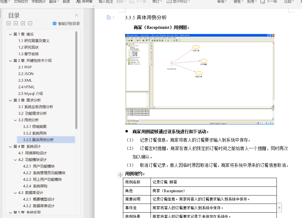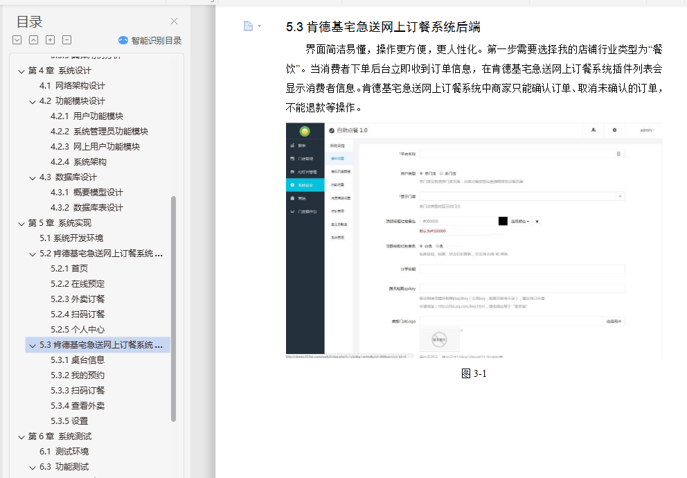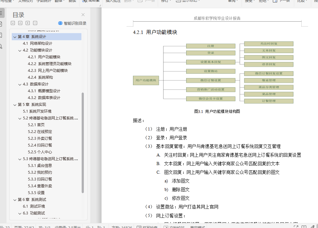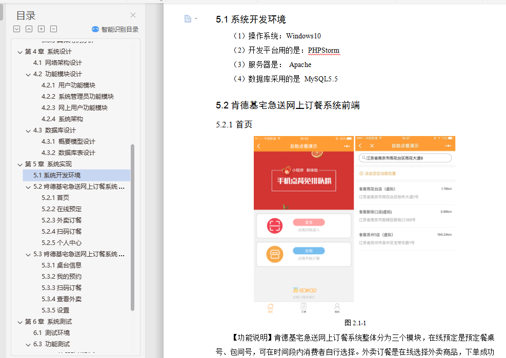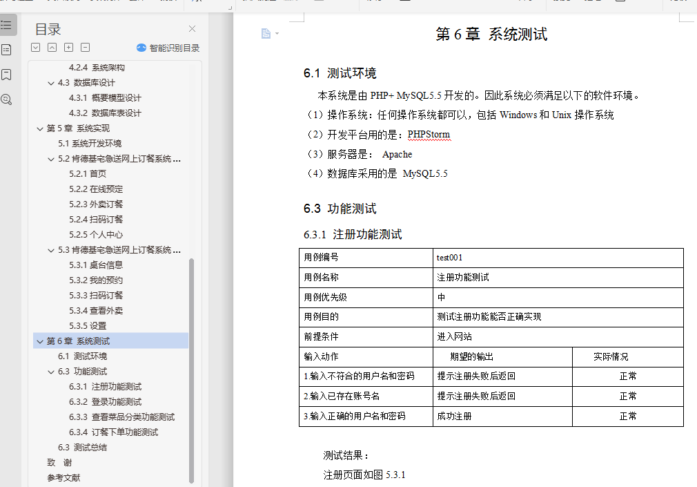 通过系统分析网上订餐系统可行性分析,对系统进行概述。分析系统目标和系统要解决的问题,然后系统功能需求分析,以及非功能需求分析。主要包括系统架构设计,系统功能架构设计,顾客信息管理,肯德基店家信息管理,系统信息模块管理。以及数据库设计,数据库概念设计,物理结构设计,以及系统安全设计。实现系统总体架构,顾客信息管理模块,顾客个信息管理,顾客订单管理,商家信息管理模块包括,商家信息管理,商家订单信息管理。以及登录注册模块的实现。最后介绍测试方案和测试方法,测试每一个模块的功能,用测试案例的实现说明测试结果。