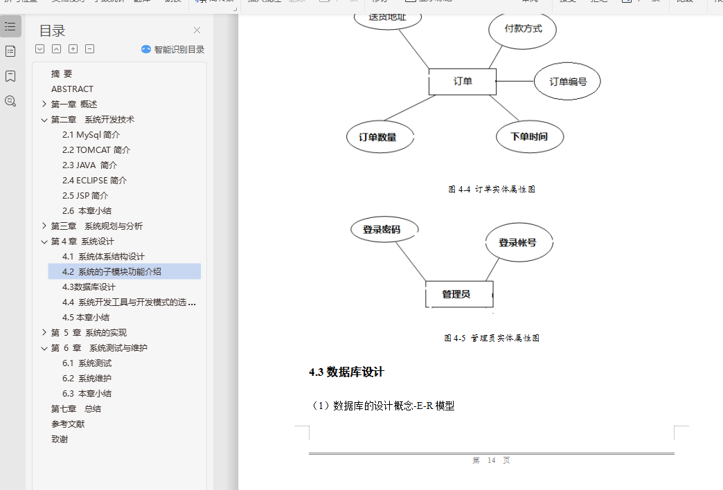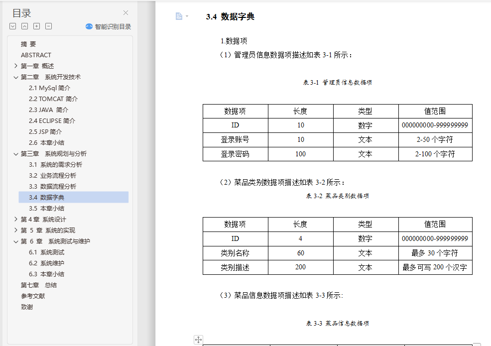 摘 要随着电子商务的飞速发展,人们工作效率的逐渐提高。方便、快捷、个性化的网上订餐服务正在进入人们的生活。网上订餐系统为商家提供有效的管理方式,节省了宣传、店面等费用,为顾客提供了方便、快捷、优惠的订餐方式。本论文对网上订餐系统的设计与实现进行了详细的分析与描述。网上订餐的管理系统要既能满足客户的订餐需求,又要满足自己的业务流程需求。本论文主要是从系统概述,系统分析,系统设计和系统实现这四方面来进行说明。本系统采用B/S结构进行设计,使用SQL Server构建数据库,以ECLIPSE为设计语言,TOMCAT作为网页服务器来开发一个功能较为完善的订餐系统。前台页面提供给顾客方便的实现网上订餐,而且能够查看本人信息、订单信息以及网上留言。后台管理实现会员管理、菜单管理、订单管理、留言管理等基本网上订餐功能。不仅方便顾客了解热销美食,而且利于商家制定销售策略。关键词:网络订餐,B/S结构,JSP ,SQLTHE Design and implementation of XIAO PENG’S restaurant online ordering systemABSTRACTWith the rapid development of e-commerce, people gradually improve work efficiency. Convenient, fast, personalized online ordering services are entering people's lives. Online reservation system for businesses to provide effective management, saving publicity, stores and other costs, to provide customers with a convenient, fast, preferential ordering methods.In this paper, the design and implementation of online ordering system for a detailed analysis and description. Online ordering management system must not only meet the needs of customers ordering, but also to meet the needs of their business processes. This paper mainly from the system overview, system analysis, system design and system implementation of these four areas to be explained.The system uses B / S structure design, build databases using SQL Server, in ECLIPSE design language, TOMCAT as a web server to develop a morecomprehensive reservation system function. Front page provided to facilitate the realization of the customer online ordering, but also be able to view my information, order information and online message. Manage achieve membership management, menu management, order management, message management and other basic online ordering capabilities. Customers will not only facilitate understanding of hot dishes, but also helps businesses develop marketing strategies.Keywords: Ordering, B / S structure, JSP, SQL目 录摘 要 IABSTRACT II第一章 概述 11.1 课题背景 11.2 目的和意义 11.3总体设计原则 11.4 本章小结 2第二章 系统开发技术 32.1 SQL SERVER 2005简介 32.2 TOMCAT简介 32.3 JAVA 简介 32.4 ECLIPSE简介 42.5 JSP简介 42.6 本章小结 4第三章 系统规划与分析 53.1 系统的需求分析 53.2 业务流程分析 63.3 数据流程分析 93.4 数据字典 113.5 本章小结 12第4章 系统设计 134.1 系统体系结构设计 134.2 系统的子模块功能介绍 134.3 数据库设计 164.4 系统开发工具与开发模式的选择 194.5本章小结 20第 5 章 系统的实现 215.1 系统首页 215.2 用户注册登录模块 215.3 系统后台登录模块 225.4 用户管理模块 235.5 菜品类别管理模块 255.6 菜品管理模块 255.7 订单管理模块 265.8 本章小结 28第 6 章 系统测试与维护 296.1 系统测试 296.2 系统维护 306.3 本章小结 31总结 32参考文献 33致谢 34附录 35