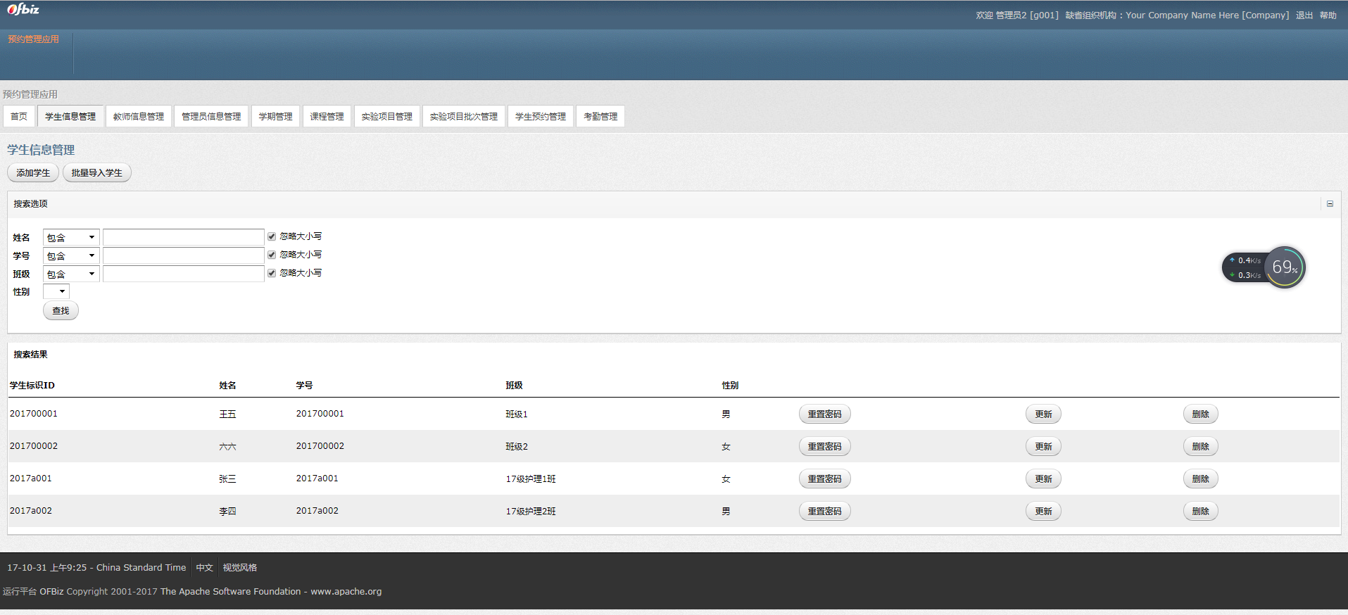 该实验室综合管理系统以JavaWeb,ssh框架作为开发基础,用MyEclipse作为开发工具,以MySQL作为数据库,在页面中使用了JQUERY和AJAX技术进行处理。实现了其中的主要功能模块,如管理员管理,实验课程管理,学生考勤管理,考勤统计,数据导出等功能。管理员具有管理教师和学生等权限,添加修改和删除机房功能,制定计算机实验室大纲,添加通知,进行财产清查。对教师对机房的预约进行批复。管理实验室课程。统计预约情况和机房使用情况。教师对机房进行预约,开启签到,统计课程签到情况,借用计算机实验室财产,归还。学生进行课程签到,进行机房预约。查看实验室课程和教师通知。