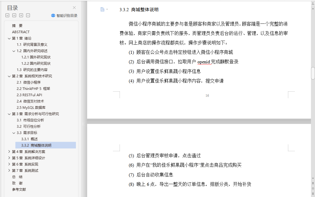 摘 要随着“互联网+”的大潮兴起,平台型应用再受热捧。其中,微信小程序凭借其强大的用户基础及其应用时的便捷而深受欢迎。在此基础上,以小程序为载体的社群电商,将具有相同兴趣的社群成员组织在一起,推广与之需求高度匹配的产品或服务,轻松实现流量变现。因此,结合以上优势设计并实现基于PHP的佳乐鲜果蔬小程序,具有一定的研究意义和商业价值,符合我国互联网精准化营销和个性化服务的趋势。本系统主要由微信小程序客户端、服务器、数据管理端构成,服务器采用 ThinkPHP5框架技术,客户端采用微信小程序的MINA框架,数据管理端采用 CMS框架。客户端的页面实现通过网络与服务器REST API接口通信获取 MySQL数据。本人重点参与网上购物系统客户端、服务器以及数据库的设计、开发、测试工作。 在系统的设计与实现过程中,对客户端的代码进行全局的MVC模式设计控制,采用template模板增加代码的复用性,并创建客户端用户的token管理机制进行用户身份验证与权限分级。本文重点阐述佳乐鲜果蔬小程序客户端的商品信息展示、商品分类、购物车、下单支付,个人信息管理及数据库设计六大模块的设计和实现过程。采用了PHP作为后台开发语言,HTML+JS+CSS作为前端开发语言,遵守微信的开发规范,完成了佳乐鲜果蔬小程序的基本功能,系统运行流畅,可以正常使用。关键词:电商;PHP;佳乐鲜果蔬小程序;购物ABSTRACTWith the rise of "Internet ", platform-based applications are becoming more popular. Among them, WeChat Mini Program with its strong user base and its application when convenient and popular. On the basis of this, the community e-commerce with the small program as the carrier, will have the same interest community members to organize together, promotes the product or the service which is highly matched with its demand, realizes the flow realization easily. Therefore, combining the above advantages to design and implement the PHP based Jiale fresh fruit and vegetable Mini Programs has certain research significance and commercial value, which is in line with the trend of precision marketing and personalized service in China's Internet.The system is mainly composed of WeChat Mini Program client, server, data management end, the server adopts ThinkPHP5 framework technology, the client adopts the Minia framework of WeChat Mini Program, and the data management end adopts CMS framework. The client's page implementation acquires MySQL data by communicating with the server REST API interface through the network. I focus on the online shopping system client, server and database design, development, testing work. In the design and implementation of the system, the client code for the global MVC pattern design control, using templat e Template increases the reusability of the code, and creates the client user's token management mechanism for user authentication and permission grading. This paper focuses on the design and implementation of the six modules of the commodity information display, commodity classification, shopping cart, order payment, personal information management and database design of the small program client. Using PHP as the background development language, HTML JSCSS as the front-end development language, following the development specifications of WeChat, completed the basic functions of the happy fruit and vegetable Mini Programs, the system runs smoothly, can be used normally.Keywords: E-commerce; PHP; Happy Fruit and Vegetable Mini Programs; Shopping目 录摘 要 IABSTRACT II第1章 绪论 11.1 研究背景及意义 11.2 国内外研究综述 11.2.1国外研究现状 11.2.2国内研究现状 21.3 研究的主要内容 4第2章 系统相关技术研究 62.1 微信小程序 62.2 ThinkPHP 5 框架 82.3 RESTFul API 92.4 微信支付技术 112.5 MySQL数据库 13第3章 需求分析与可行性研究 153.1 市场定位分析 153.2 可行性分析 153.3 需求目标 163.3.1 概述 163.3.2 商城整体说明 16第4章 系统解决方案 184.1 设计方案的论证 184.1.1 设计方案的选择 184.1.2 工具的选择 184.2 设计方案的说明 194.2.1 系统总体描述 194.2.2 系统角色类型 194.2.3 系统规划 214.2.4 预期目的 214.2.5 技术要求 22第5章 系统详细设计 235.1 系统模块架构 235.2 系统功能说明 245.2.1 系统登录模块 245.2.2 佳乐鲜果蔬小程序设置模块 245.2.3 佳乐鲜果蔬小程序内容更改模块 265.2.4 佳乐鲜果蔬小程序管理员模块 275.2.5 基本商城功能模块 285.3 数据字典 29第6章 系统实现 336.1 模块实现的理论基础 336.2 系统登录模块的实现 336.3 设置佳乐鲜果蔬小程序信息模块的实现 336.4 佳乐鲜果蔬小程序选货模块的实现 416.4.1 选货模块 416.4.2 选货后编辑及提交模块 426.5 管理员审核模块 45第7章 系统测试 477.1 概述 477.2 系统测试用例 477.3 测试总结 49总 结 50致 谢 51参考文献 52