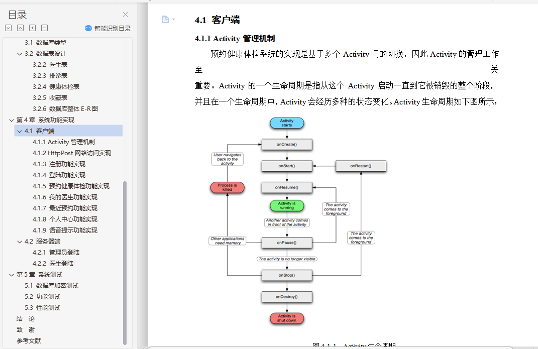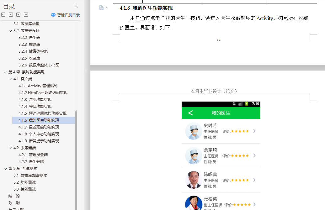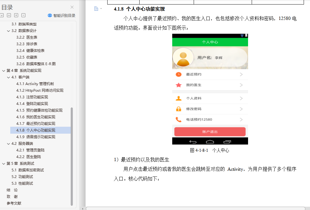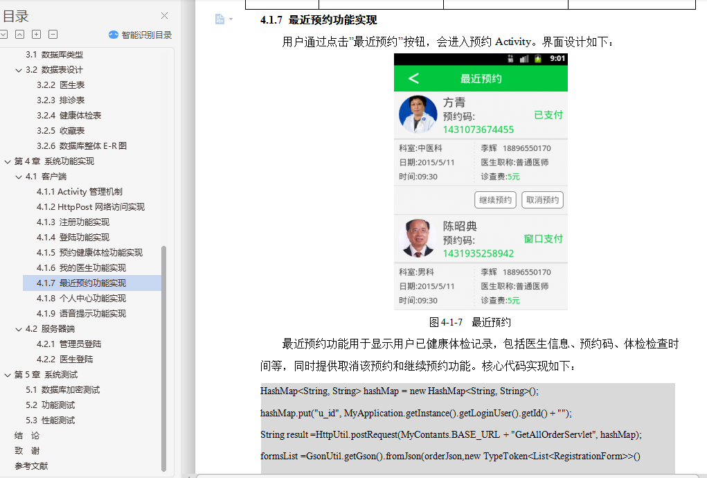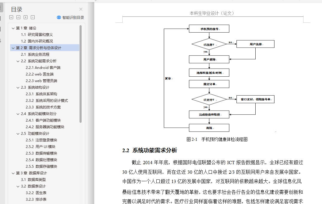 健康体检预约app的设计与实现摘 要随着计算机技术和网络技术的发展,信息系统已在医疗卫生机构和卫生管理机构中得到了广泛的使用。但是由于卫生行业的业务量大且覆盖范围广、涉及的技术领域多、数据标准不一致、原有信息系统孤立开发和各地卫生信息化水平不一致等问题,使我国卫生信息化建设目前还处于积极探索与研究阶段。根据查阅中外文献资料,本论文研究将结合健康体检前、体检中、体检后的三个阶段,来实现健康体检预约系统手机端的设计。在APP手机端能够设计体检预约、健康数据、健康分析等多个功能,帮助用户快速就医并分析健康指标数据,助力体检用户准确了解自己的身体健康状况,并能追踪体检客户的健康管理,一定程度上解决现有健康管理系统存在的缺陷。通过到我市当地医院及体检中心实地社会调查,来改进医院智慧医疗系统的一些操作流程,减少患者操作步骤、增强智慧医疗的容错机制、优化翻译错误提示和系统自我恢复等方法,使患者更乐于使用医院智慧医疗平台。通过本系统客户需求设计手机端APP的特色功能:体检预约、健康数据记录、健康分析等,帮助用户在移动端进行健康常识的查询,及时有效减低患病率;帮助用户在手机端进行预约,免除医院排队的困扰;记录用户的健康数据,着力系统的多功能设计,为诊疗提供更为便利的条件。关键词:健康体检;预约健康体检;APP设计;健康数据AbstractWith the development of computer technology and network technology,information systems have been widely used in medical and health institutions and health management institutions. However,the health information construction of our country is still in the active exploration and research stage because of the large volume of business and the wide coverage of the health industry,the many technical fields involved,the inconsistency of data standards,the isolated development of the original information system and the inconsistency of the level of health information in various places. According to the reference of Chinese and foreign literature,this thesis will combine the three stages before,during and after the health examination to realize the design of the mobile phone end of the health examination appointment system. On the app phone Design physical examination appointment,health data,health analysis and other functions to help users quickly seek medical treatment and analyze health index data,help physical examination users to understand their own health status accurately,and can track the health management of physical examination customers,to a certain extent to solve the defects of the existing health management system.Through the field social investigation of the local hospital and the medical examination center in our city,we can improve some operation flow of the hospital intelligent medical system,reduce the operation steps of the patients,strengthen the fault-tolerant mechanism of the intelligent medical treatment,optimize the translation error prompt and the system self-recovery,so that the patients are more willing to use the hospital intelligent medical platform.Through the system customer demand design mobile phone side app features: medical appointment,health data records,health analysis,etc.,to help users in the mobile side of health common sense query,timely and effective reduction of prevalence;help users in the mobile phone to make appointments to avoid hospital queues;record user health data,focus on the multi-functional design of the system to provide more convenient conditions for diagnosis and treatment.Keywords: health check-up;appointment registration;app design;health data目录第1章 绪论 21.1 研究背景和意义 21.2 国内外研究概况 3第2章 需求分析与总体设计 52.1 系统业务流程 52.2 系统功能需求分析 62.2.1 Android客户端 72.2.2 web医生端 72.2.3 web管理员端 72.3 系统结构设计 82.3.1 系统体系架构 82.3.2 系统采用的设计模式 82.3.3 系统的技术方案 92.4 系统功能模块划分 112.4.1 客户端功能模块 112.4.2 服务器端功能模块 112.5 功能模块设计 122.5.1 注册登录模块 122.5.2 用户UI模块 122.5.3 数据传输模块 122.5.4 数据处理模块 132.5.5 数据存储模块 13第3章 数据库设计 143.1 数据库类型 143.2 数据表设计 153.2.2 医生表 153.2.3 排诊表 163.2.4 健康体检表 163.2.5 收藏表 173.2.6 数据库整体E-R图 17第4章 系统功能实现 184.1 客户端 184.1.1 Activity管理机制 184.1.2 HttpPost网络访问实现 194.1.3 注册功能实现 204.1.4 登陆功能实现 224.1.5 预约健康体检功能实现 254.1.6 我的医生功能实现 324.1.7 最近预约功能实现 344.1.8 个人中心功能实现 354.1.9 语音提示功能实现 384.2 服务器端 394.2.1 管理员登陆 394.2.2 医生登陆 40第5章 系统测试 415.1 数据库加密测试 415.2 功能测试 425.3 性能测试 48结 论 49致 谢 50参考文献 51
