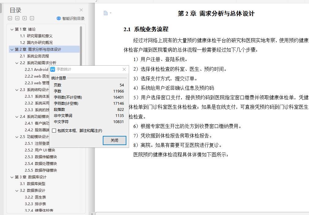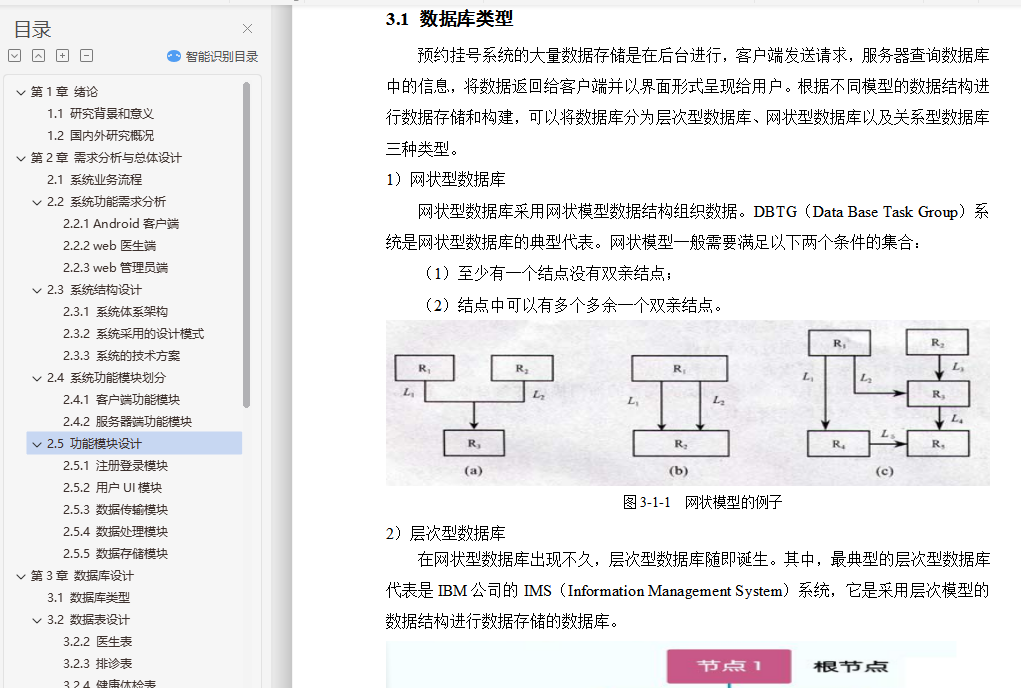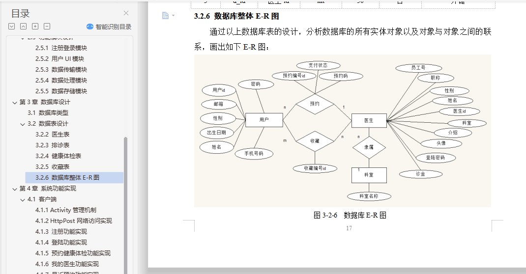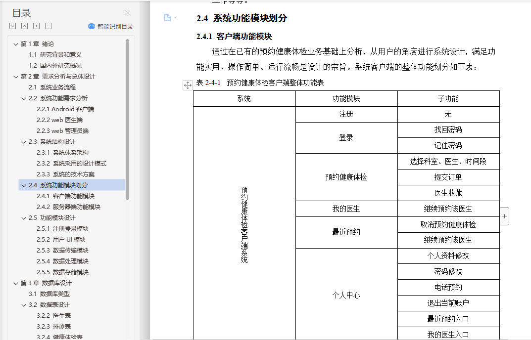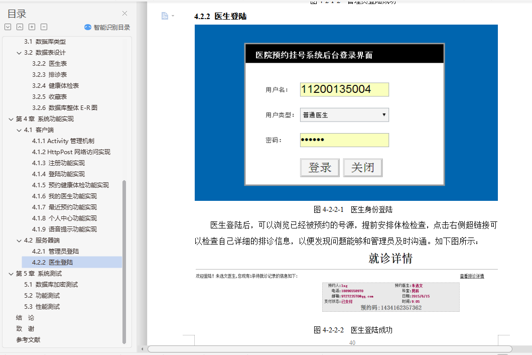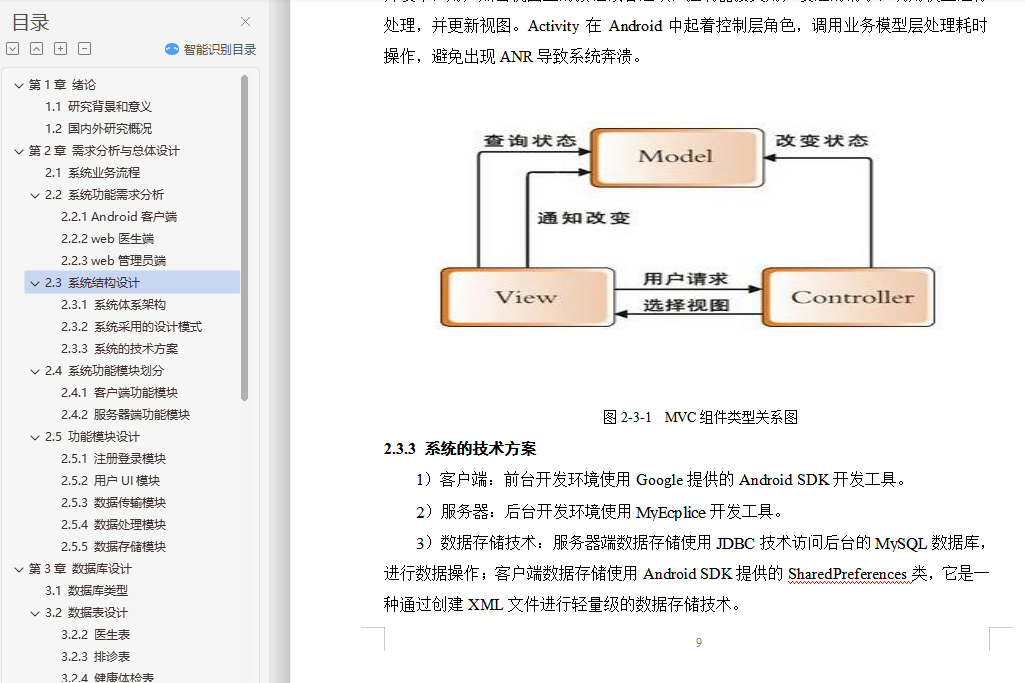 健康体检预约app的设计与实现摘 要随着计算机技术和网络技术的发展,信息系统已在医疗卫生机构和卫生管理机构中得到了广泛的使用。但是由于卫生行业的业务量大且覆盖范围广、涉及的技术领域多、数据标准不一致、原有信息系统孤立开发和各地卫生信息化水平不一致等问题,使我国卫生信息化建设目前还处于积极探索与研究阶段。根据查阅中外文献资料,本论文研究将结合健康体检前、体检中、体检后的三个阶段,来实现健康体检预约系统手机端的设计。在APP手机端能够设计体检预约、健康数据、健康分析等多个功能,帮助用户快速就医并分析健康指标数据,助力体检用户准确了解自己的身体健康状况,并能追踪体检客户的健康管理,一定程度上解决现有健康管理系统存在的缺陷。通过到我市当地医院及体检中心实地社会调查,来改进医院智慧医疗系统的一些操作流程,减少患者操作步骤、增强智慧医疗的容错机制、优化翻译错误提示和系统自我恢复等方法,使患者更乐于使用医院智慧医疗平台。通过本系统客户需求设计手机端APP的特色功能:体检预约、健康数据记录、健康分析等,帮助用户在移动端进行健康常识的查询,及时有效减低患病率;帮助用户在手机端进行预约,免除医院排队的困扰;记录用户的健康数据,着力系统的多功能设计,为诊疗提供更为便利的条件。关键词:健康体检;预约健康体检;APP设计;健康数据AbstractWith the development of computer technology and network technology,information systems have been widely used in medical and health institutions and health management institutions. However,the health information construction of our country is still in the active exploration and research stage because of the large volume of business and the wide coverage of the health industry,the many technical fields involved,the inconsistency of data standards,the isolated development of the original information system and the inconsistency of the level of health information in various places. According to the reference of Chinese and foreign literature,this thesis will combine the three stages before,during and after the health examination to realize the design of the mobile phone end of the health examination appointment system. On the app phone Design physical examination appointment,health data,health analysis and other functions to help users quickly seek medical treatment and analyze health index data,help physical examination users to understand their own health status accurately,and can track the health management of physical examination customers,to a certain extent to solve the defects of the existing health management system.Through the field social investigation of the local hospital and the medical examination center in our city,we can improve some operation flow of the hospital intelligent medical system,reduce the operation steps of the patients,strengthen the fault-tolerant mechanism of the intelligent medical treatment,optimize the translation error prompt and the system self-recovery,so that the patients are more willing to use the hospital intelligent medical platform.Through the system customer demand design mobile phone side app features: medical appointment,health data records,health analysis,etc.,to help users in the mobile side of health common sense query,timely and effective reduction of prevalence;help users in the mobile phone to make appointments to avoid hospital queues;record user health data,focus on the multi-functional design of the system to provide more convenient conditions for diagnosis and treatment.Keywords: health check-up;appointment registration;app design;health data目录第1章 绪论 21.1 研究背景和意义 21.2 国内外研究概况 3第2章 需求分析与总体设计 52.1 系统业务流程 52.2 系统功能需求分析 62.2.1 Android客户端 72.2.2 web医生端 72.2.3 web管理员端 72.3 系统结构设计 82.3.1 系统体系架构 82.3.2 系统采用的设计模式 82.3.3 系统的技术方案 92.4 系统功能模块划分 112.4.1 客户端功能模块 112.4.2 服务器端功能模块 112.5 功能模块设计 122.5.1 注册登录模块 122.5.2 用户UI模块 122.5.3 数据传输模块 122.5.4 数据处理模块 132.5.5 数据存储模块 13第3章 数据库设计 143.1 数据库类型 143.2 数据表设计 153.2.2 医生表 153.2.3 排诊表 163.2.4 健康体检表 163.2.5 收藏表 173.2.6 数据库整体E-R图 17第4章 系统功能实现 184.1 客户端 184.1.1 Activity管理机制 184.1.2 HttpPost网络访问实现 194.1.3 注册功能实现 204.1.4 登陆功能实现 224.1.5 预约健康体检功能实现 254.1.6 我的医生功能实现 324.1.7 最近预约功能实现 344.1.8 个人中心功能实现 354.1.9 语音提示功能实现 384.2 服务器端 394.2.1 管理员登陆 394.2.2 医生登陆 40第5章 系统测试 415.1 数据库加密测试 415.2 功能测试 425.3 性能测试 48结 论 49致 谢 50参考文献 51